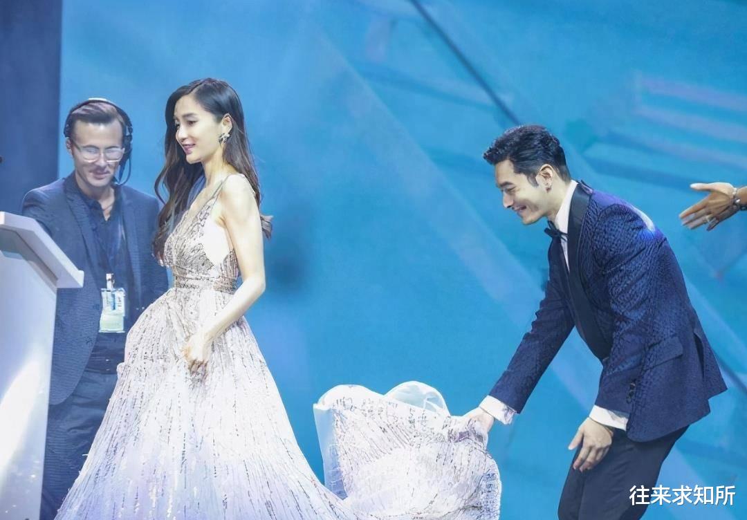 你看看人家活动现场这画面,黄晓明像个小跟班似的,躬着身子给杨颖提裙摆。