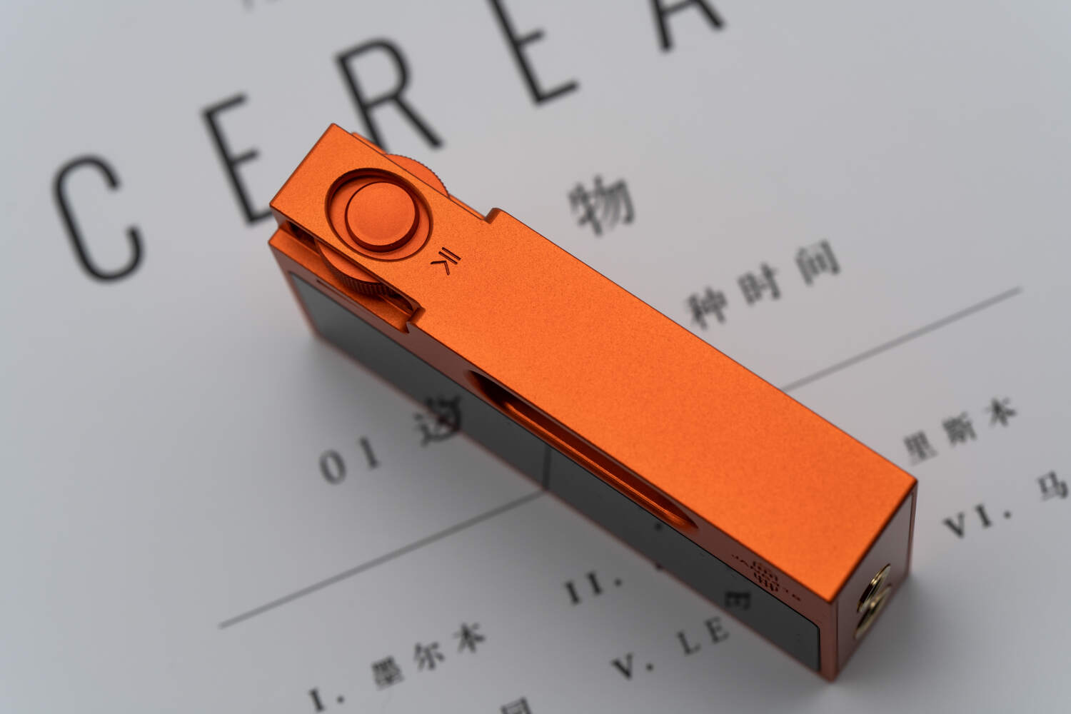 除了电子管窗口外,左上角的滚轮+按键设计也具有一定的吸睛度,而电子管窗口右侧则刻出了JAN6418电子管的型号标识;机身正面下部为一整块黑色玻璃,在偏左的位置有一块长方形横向单色屏幕用于状态显示和辅助设置。机身两端分别是3.5和4.4耳机口、TYPEC数据口。机背是钢化玻璃材质。总的说山灵UA7的外观吸睛度是很高的,尤其是我手上这台橙色版,颜色比起相对稳重的黑色和灰色要鲜亮不少。而机身外观方面既有自身特色,又带有较强的金属质感和科技感,属实是比较成功的设计语言了,在山灵自家便携产品中,也还没有出现过类似的设计。