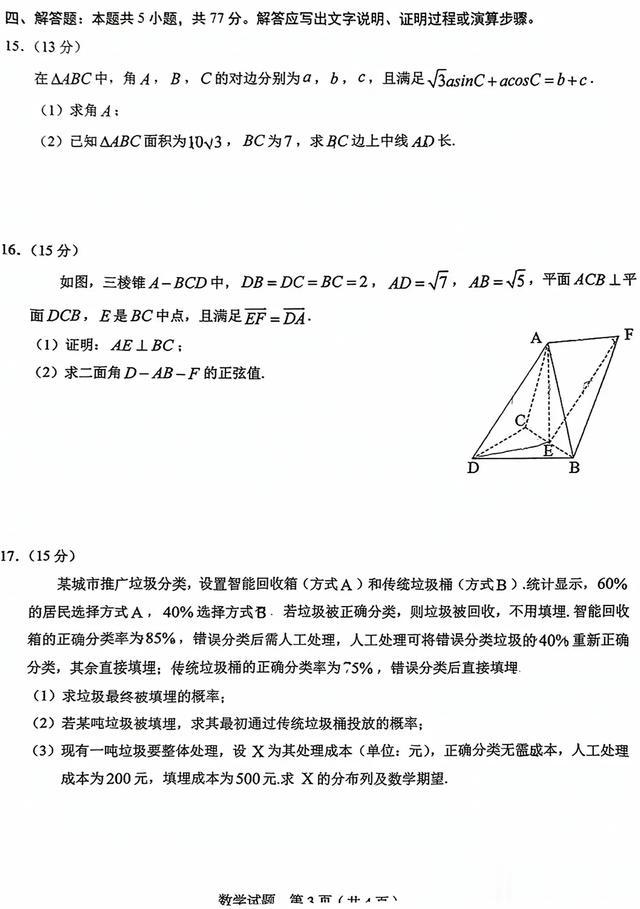 2. 贴近实际应用:第17题垃圾分类的概率统计问题,将数学与生活场景结合,体现应用价值。