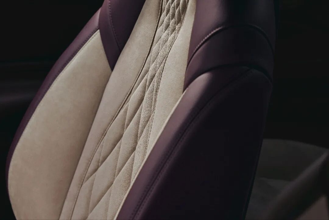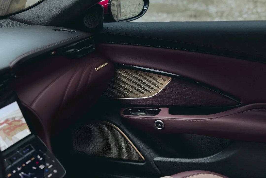 内饰部分采用勃艮第红皮革与裸色Alcantara材质拼接,搭配深酒红色缝线。细节处可见金色镀铬装饰与红色杨木实木饰板,驾驶侧门板镶有“Creata a Modena”徽标,还随车配备专属羊毛车罩。