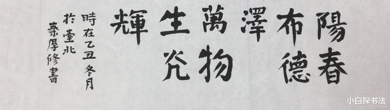 这是一幅楷书作品,其内容是“阳春布德泽,物生光辉。”,从这样的书写上看,马英九的母亲秦厚修也是文化人,对传统书法,也是有着一定的理解和认识的,而这样的字迹,也表现出一种功夫,但是,还没有达到入境的境界。