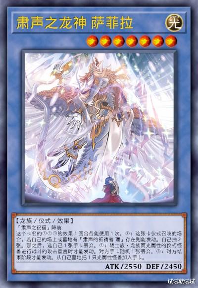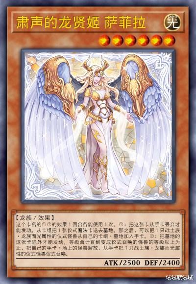肃声的龙神姬 萨菲娅。该卡可以从手牌舍弃,之后把卡组当中一张仪式魔法送入墓地从卡组当中检索一张战士 龙光属性仪式怪兽。把墓地中的此卡除外可以从手卡仪式召唤一只战士 龙光属性仪式怪兽。