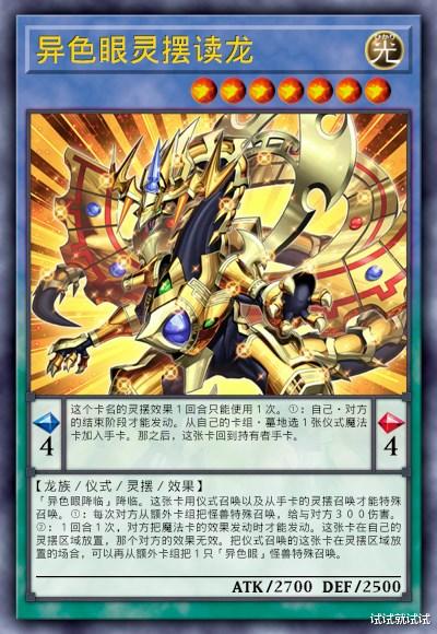 异色眼灵摆读龙。该卡是面对天杯龙环境所选择的应对卡,该卡主要是两个效果一个是对手从额外特殊召唤怪兽就烧对手的血。对手发动魔法卡时把该卡放置到灵摆区,使魔法卡效果无效,之后从额外中特殊召唤一只异色眼怪兽。而召唤的怪兽可以让战斗阶段的怪兽无法发动效果。