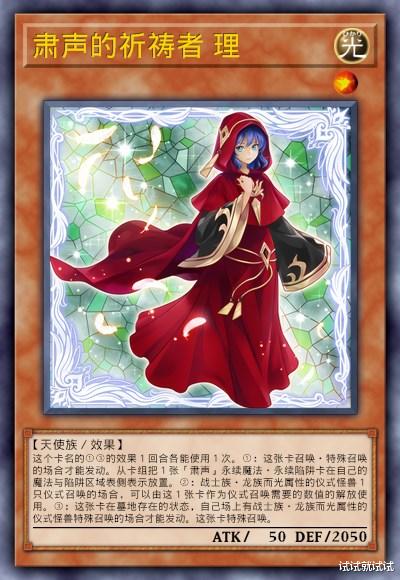 肃声之祈祷。本家的仪式魔法卡,可以用光属性怪兽做为素材召唤光属性仪式怪兽。而且该卡在墓地当中,场上的光仪式怪兽由于对手的效果离开场上,可以除外该卡从卡组当中无视条件特殊召唤,龙姬神、古圣戴、理法守护者这三只仪式怪兽中的一只。