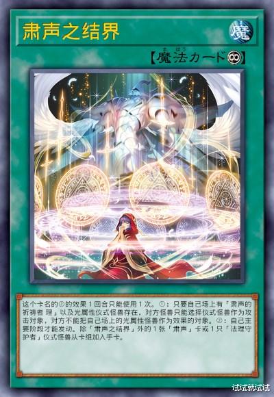肃声之结界。只要自己场上存在理以及光属性仪式怪兽时,对手只能选择光属性仪式怪兽做为攻击对象,且不能选择光属性怪兽为效果对象。自己主动阶段可以发动,把一张本家卡或者一只法理守护者加入手牌。