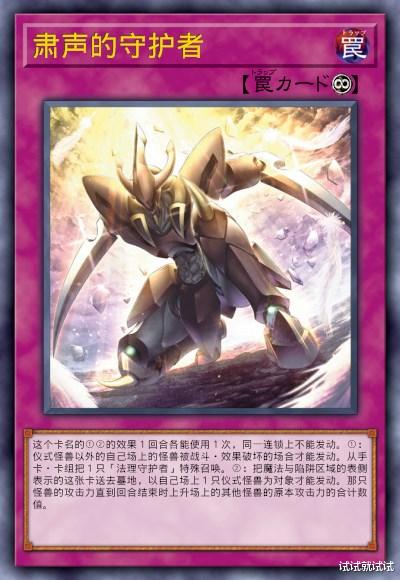 肃声的守护者。仪式怪兽以外的自己场上怪兽被破坏,从手牌 卡组中特殊召唤法理守护者。把场上的该卡送入墓地选择一只仪式怪兽,该怪兽攻击力上升场上怪兽攻击力的总和。