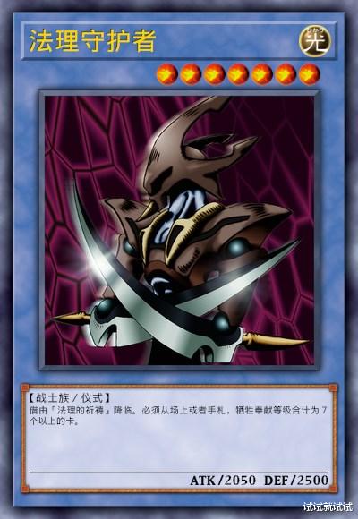 而仪式怪兽法理守护者则还是一张仪式怪兽,只是其效果对比原本版变强了许多。肃声之守护 法理守护者。该卡特殊召唤成功时从卡组将一张本家怪兽或者光龙、战士仪式怪兽加入手牌。当墓地或者场上有理存在时该卡攻击力上升2050。场上有理存在时获得一回合一次的三色康效果。