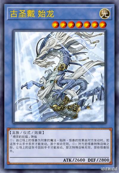 肃声的龙贤圣 始龙。该卡在手中时,可以把手牌或墓地当中包含仪式魔法的两张魔法卡返回卡组进行特殊召唤。该卡在场上时对手发动效果,把该卡返回手牌从卡组当中特殊召唤一只战士 龙光属性仪式怪兽。