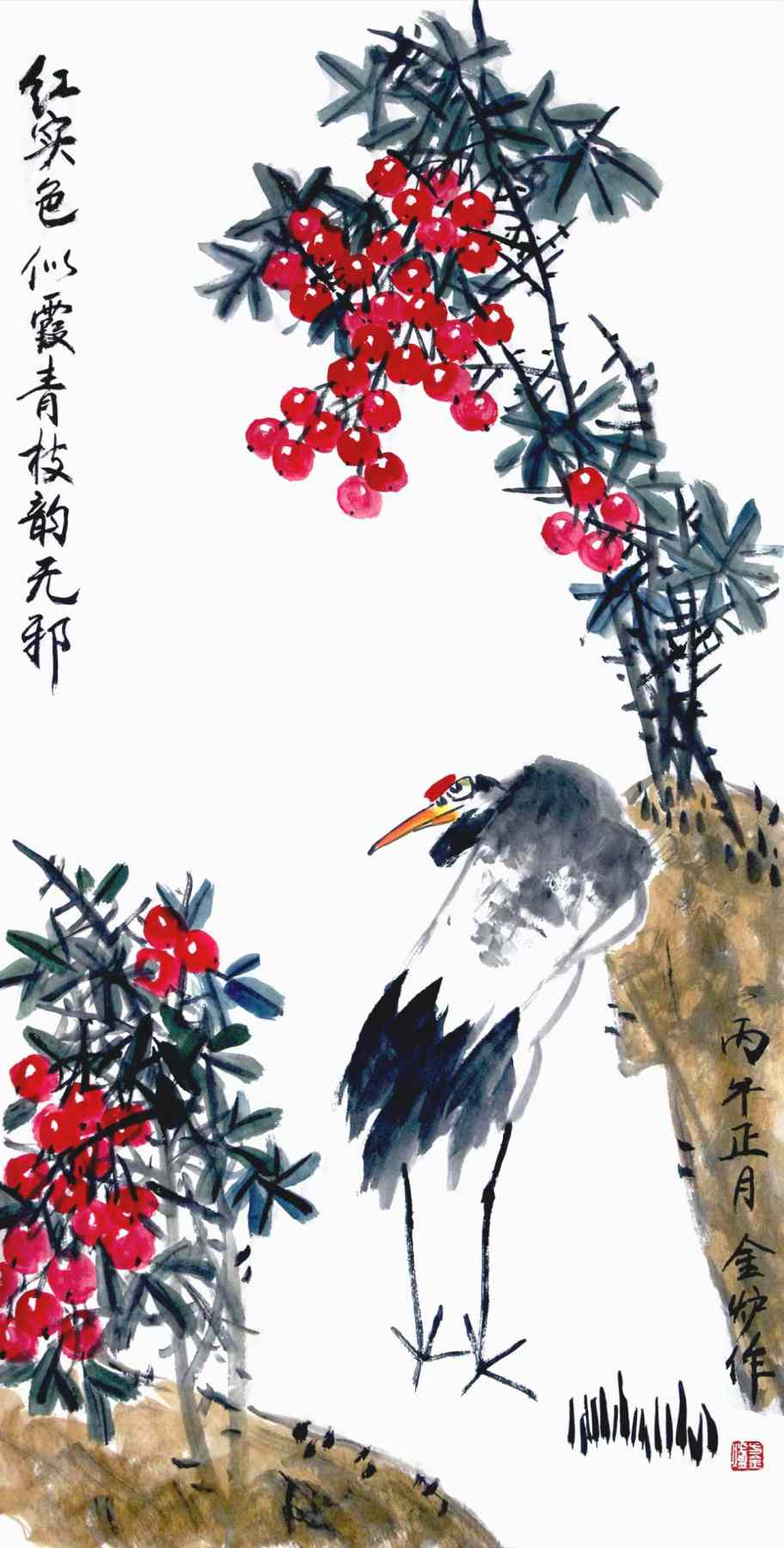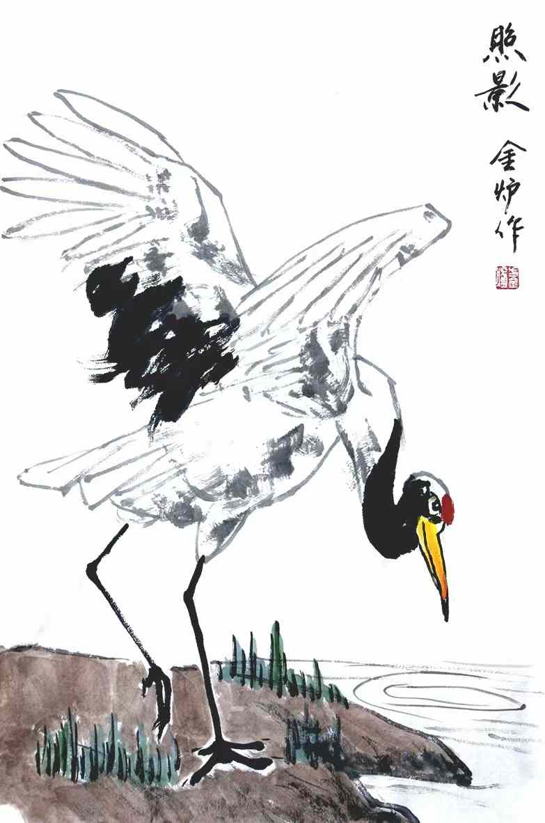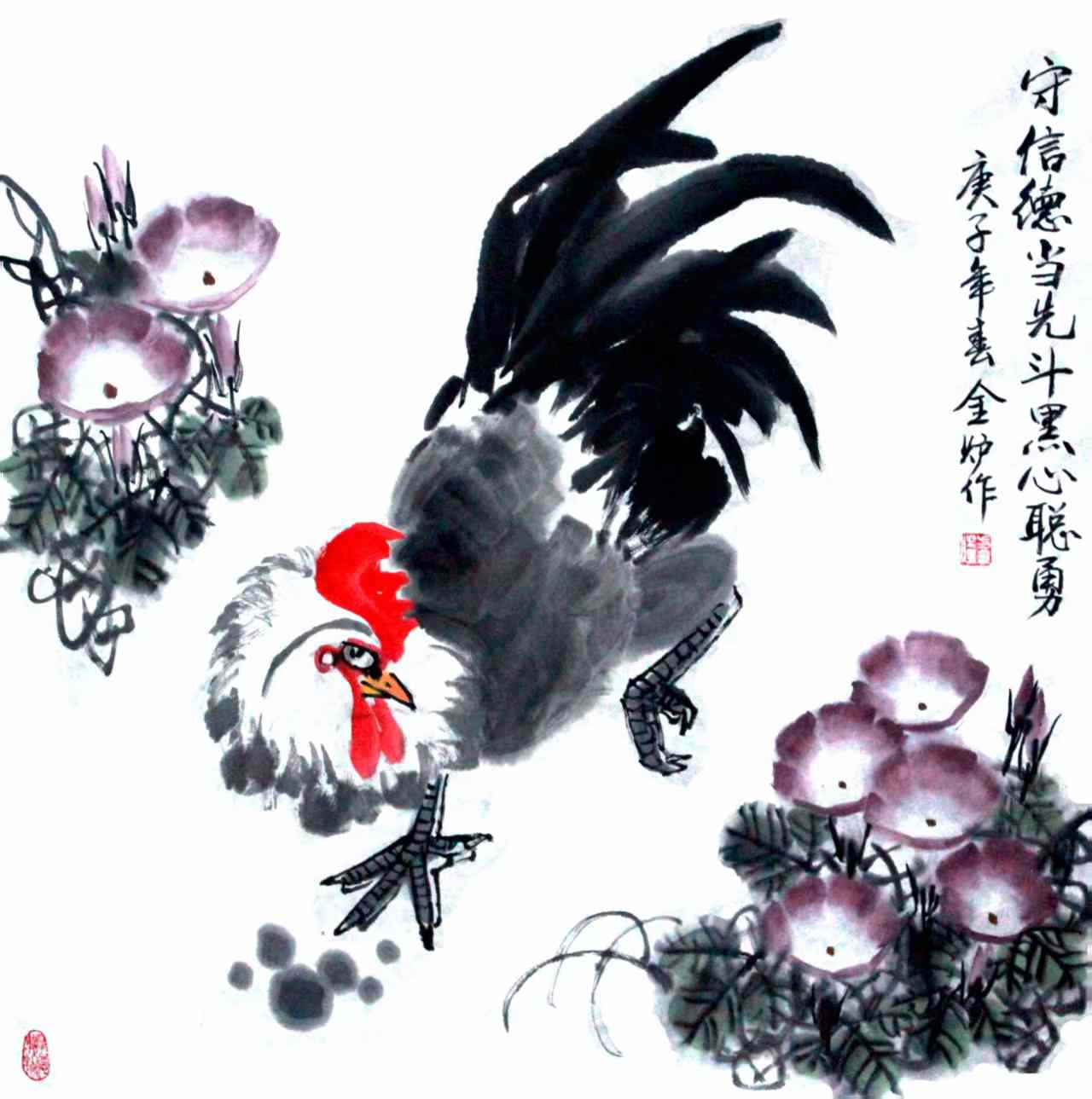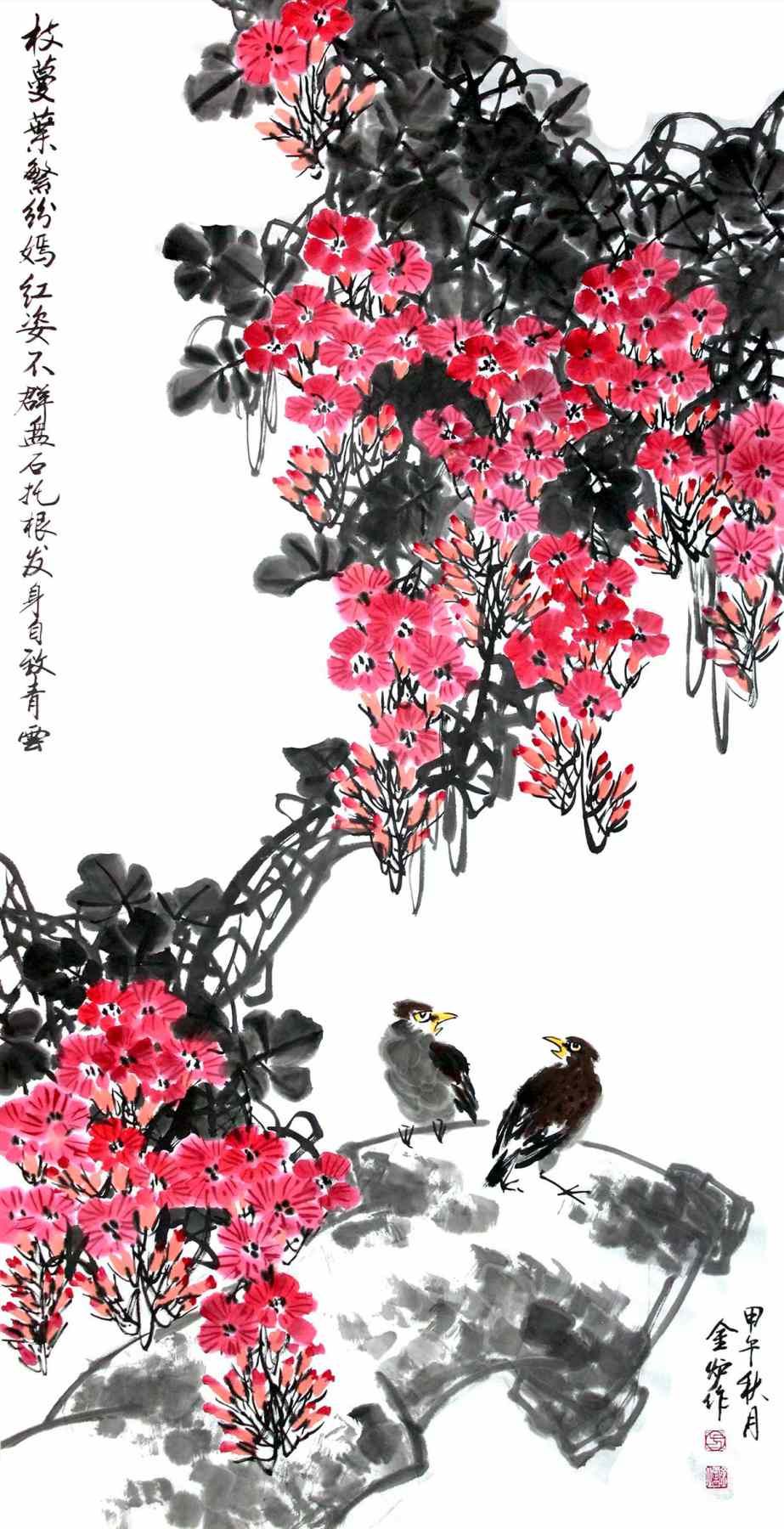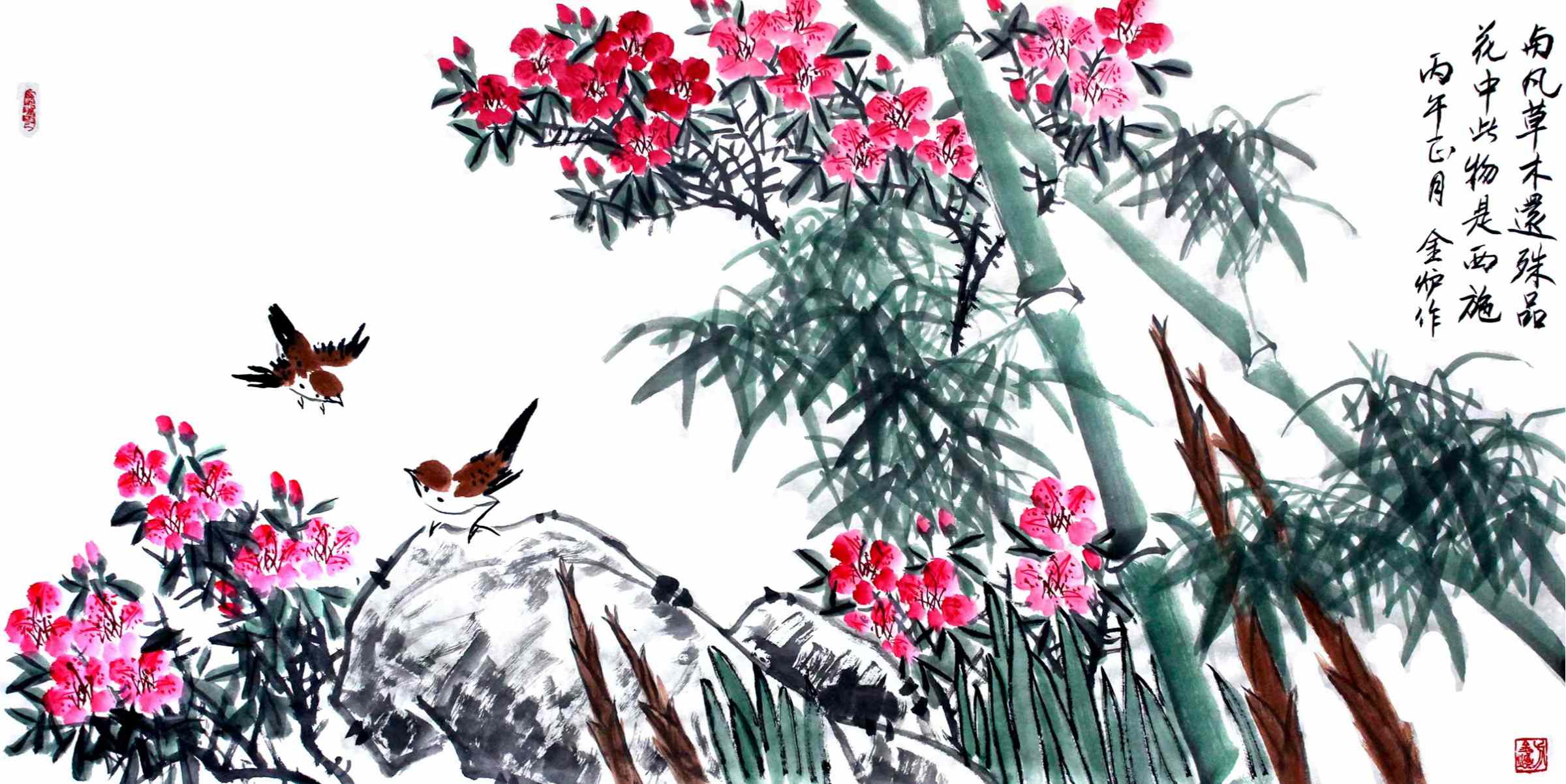 在用笔上以书入画,极注重起笔与收笔,他坚信笔的运行直接关系到线条的质量和绘画的气韵,做到了“快而不飘,重而不板,慢而不滞,松而不浮”,使作品达到生动流畅、抑扬顿挫,生动灵变、沉稳有力的艺术效果。书法用笔是方金炉小写意花鸟画笔墨技法的一大特色。例如描绘花卉根叶,方金炉从齐白石、吴昌硕等名家处吸收了大写意绘画技法,以行草书的笔法作画。但他并非一勾到底,而是笔断意连,点到为止,充分展现了枝叶的动态,更显轻盈摇曳,活泼生动。
