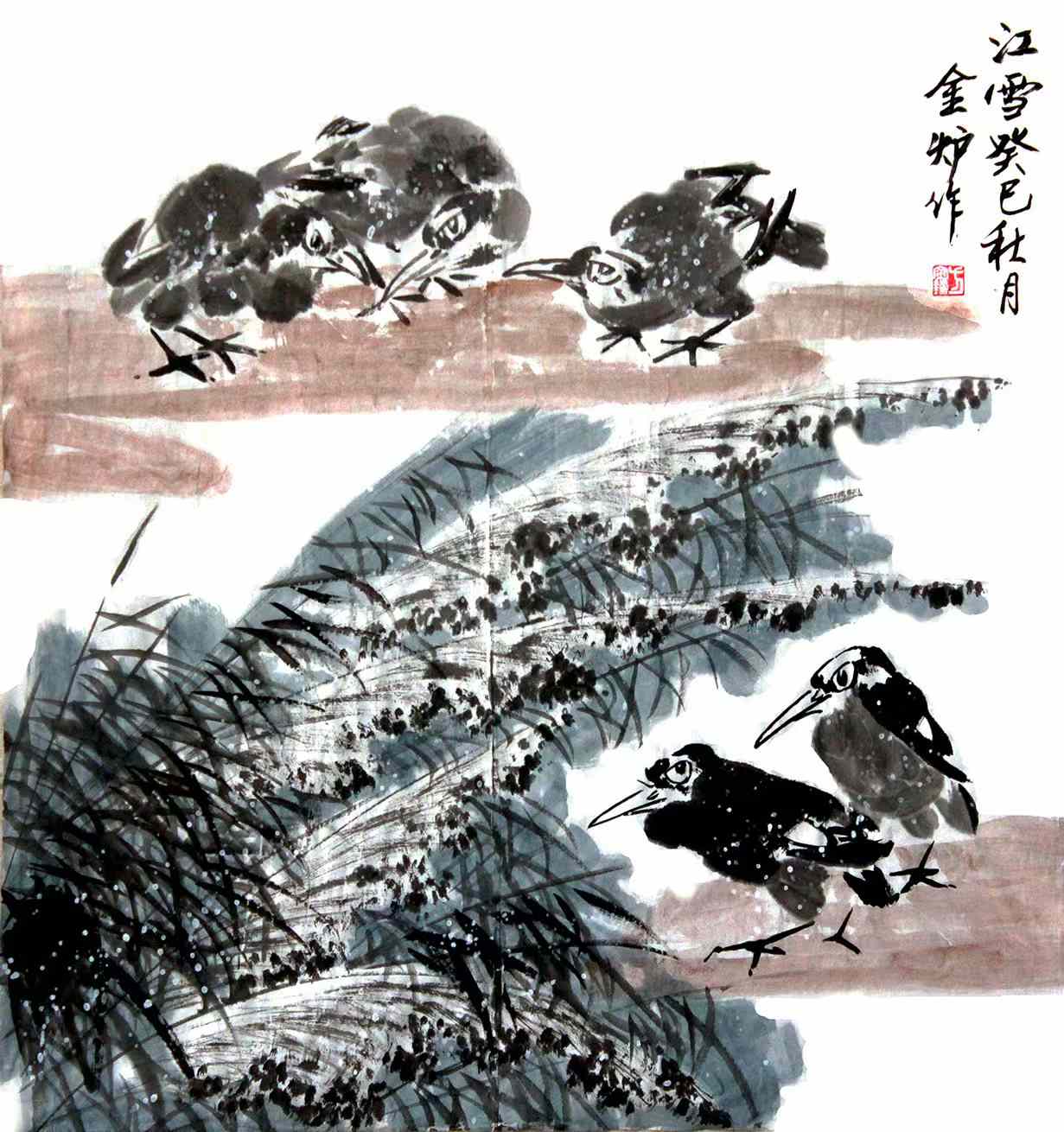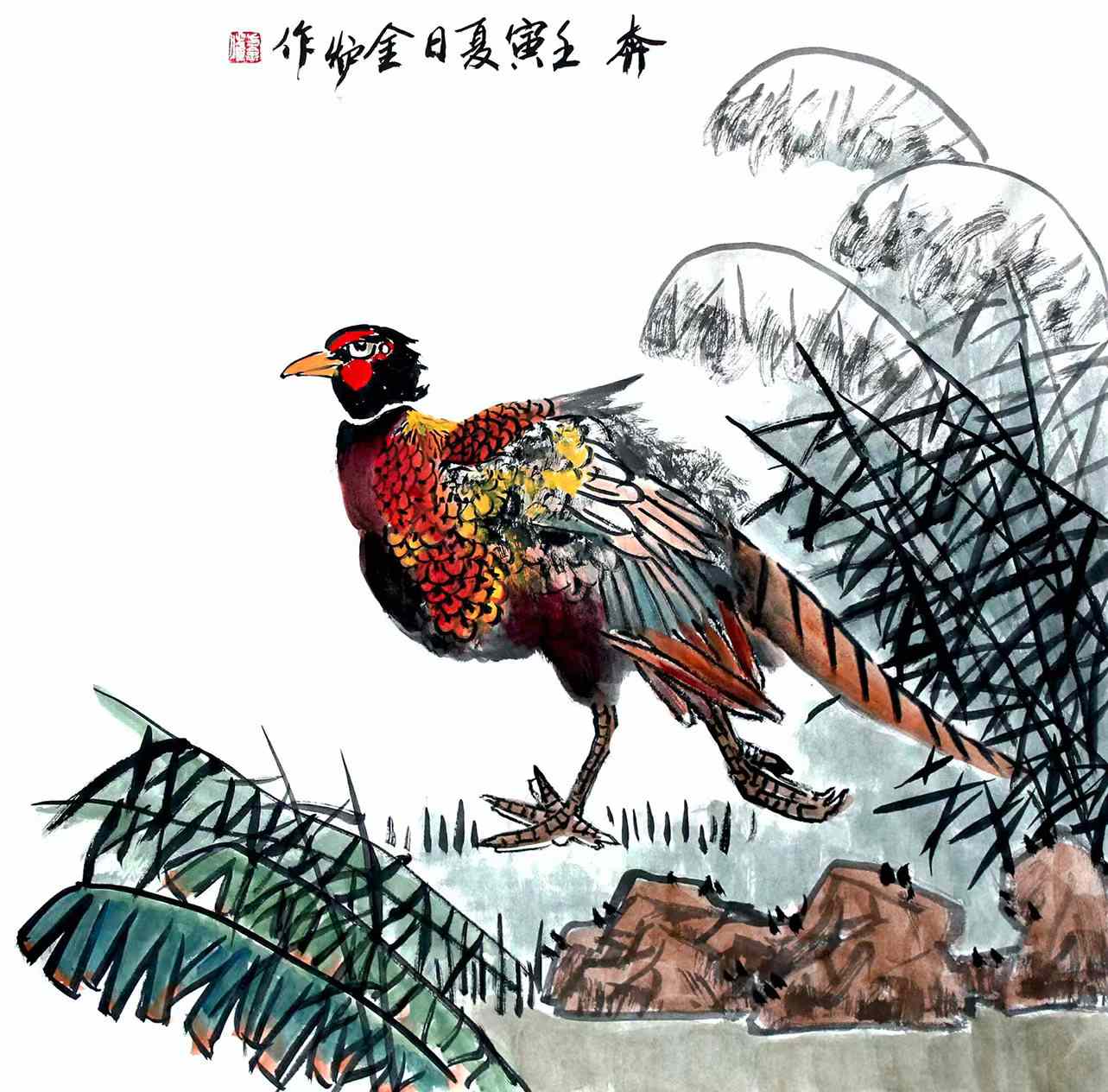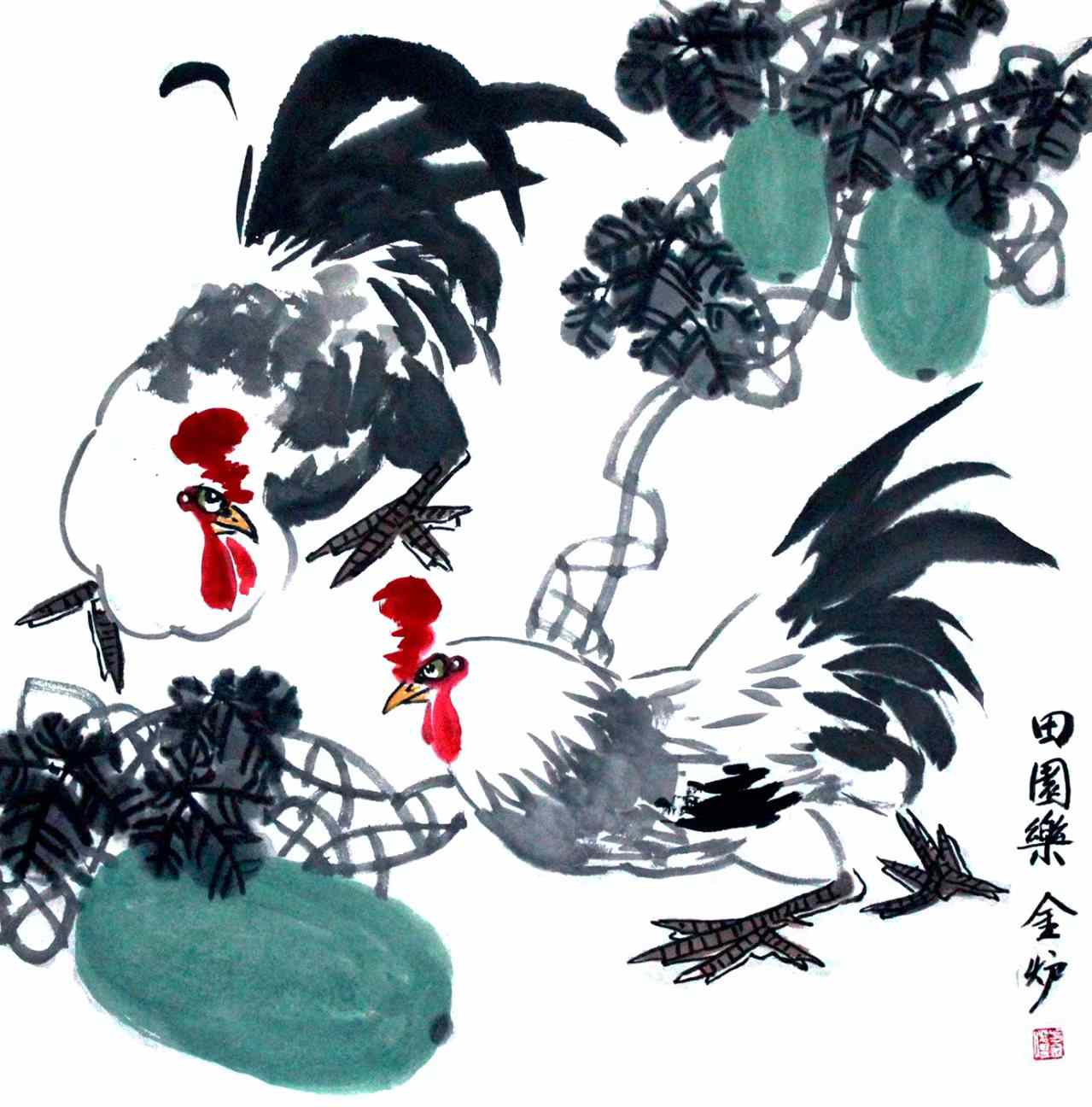 而在花鸟画领域,他则更注重微观情趣的捕捉,笔下的花鸟形神兼备,灵动自然,既有“触手成春”的鲜活感,又蕴含“象外之趣”的哲学思考。通过特殊的构思和形象塑造,巧妙地将自己的思想感情和表现对象的神韵气质交融在一起,使画面产生一种动人的意境。花鸟画有了意境,就有了灵魂,作品就有了感人的艺术魅力。因而,品味方金炉的画作,既像是一首田园诗,又像是一曲交响乐,意在象外,余味无穷。你总能从中感受到他对大自然的喜爱,对一草一木,一事一物所浸透着的情愫。所以他的画源于传统而超越传统,源于生活而高于生活,每一件作品均洋溢着纯朴的情趣和生动的意境。