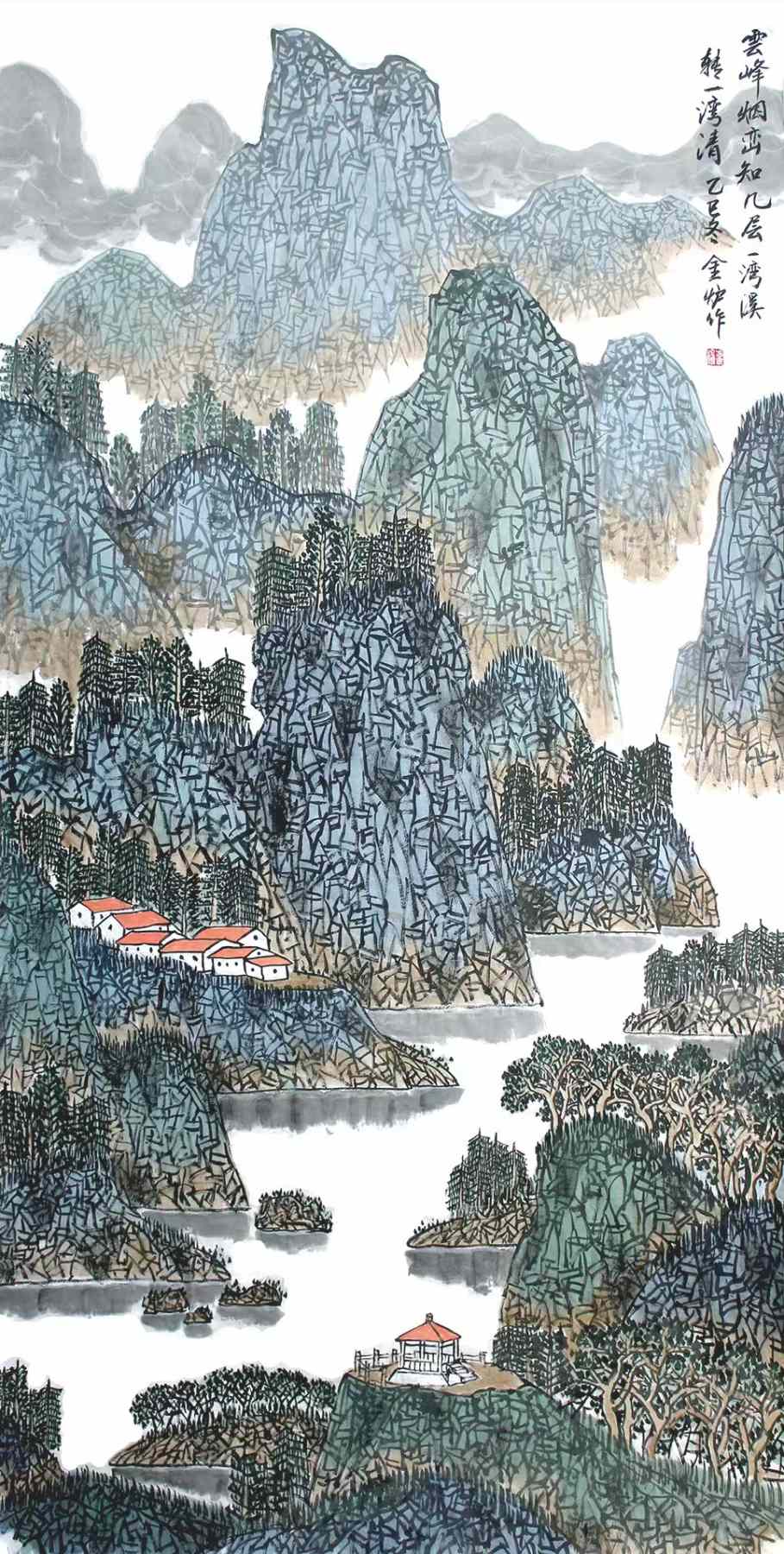 在具体的笔墨语言上,方金炉先生极具个人特色。他的线条既有书法的骨力,又有绘画的韵致,勾勒山石轮廓时如篆书般凝重圆润,表现云水流动时又似草书般肆意酣畅。在山水画创作中,他把古今山水画名家的各种皴法加以揉合,经过吸收消化之后再融合,悟出了一种极具辩识度的线皴法,结合灵活的墨法,来勾画山体,使得占据画面主要位置的山石峰峦结构呈现雄浑刚健、秀劲灵动的艺术效果,充分体现了“骨法用笔”的精髓和底韵,在构图上,运用行万里路,遍游名山大川,并幻化成胸中丘壑的万千物象,根据“外师造化,中得心源”的古训,把山体,林木,溪流,泉瀑,村舍,桥亭,楼阁,舟车,雲雾这些造景构件巧妙地组织成赏心悦目之“景”,取得画面景象美不胜收的观画效果;既有令人心神振奋荡气回肠的北方山水巍峨雄浑的宏大气势,又有使人静思妙品而回味无穷的江南山川温润秀丽的灵动优雅。
