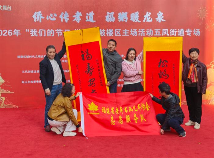 活动伊始,五凤街道领导致辞,送上节日祝福与殷切寄语。现场举行慰问与赠礼仪式,福建省居敬孝道文化交流中心理事长、省广电银色年华联盟主席游源飞、福建省老年书画艺术协会领导向五凤街道、龙泉社区赠送福建省委原常委、秘书长黄文麟题词书法作品。组织统战委员陈维莹,以及李宗明、林子利等老同志分别慰问侨胞侨眷、赠送书法作品,以墨传情、暖心聚力。