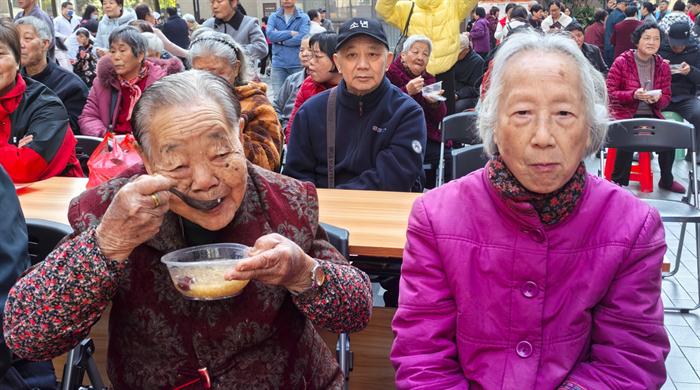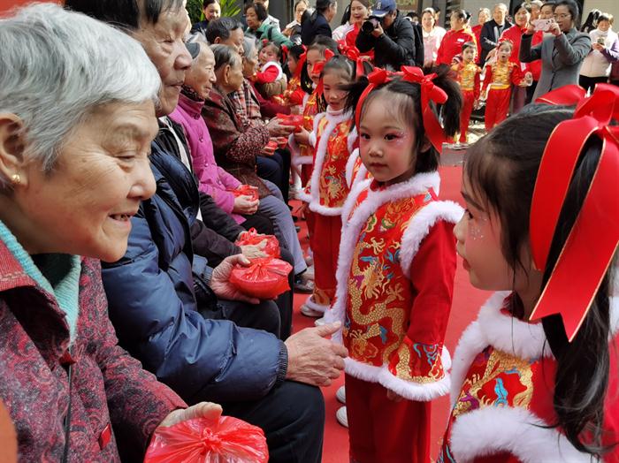 活动中,省直屏西幼儿园小朋友为百岁老人、爷爷奶奶敬献拗九粥深动场面,得到现场热烈掌声。体现孝道美德代代相转。