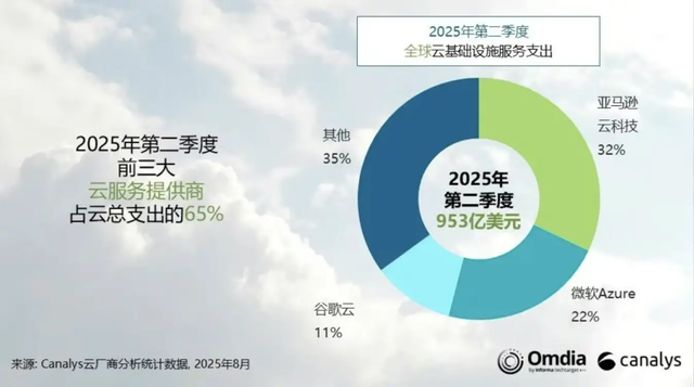 目前全球云市场由亚马逊AWS、微软Azure、谷歌云和阿里云四家厂商领跑,它们的共同特点,是都将AI确立为其增长引擎和业务重心。根据Canalys发布的2025年第二季度全球云基础设施服务市场数据,亚马逊AWS市场份额为32%,微软Azure为22%,谷歌云为11%。阿里云未单独列出,但份额也较为靠前。