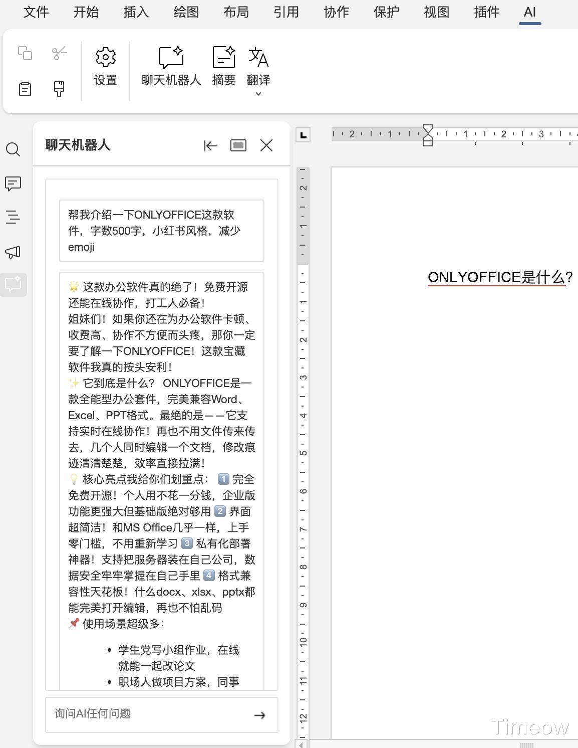 比如我想写一篇关于ONLYOFFICE的小H书笔记,但不知如何入手时,就可以像我一样直接打开聊天机器人,调用AI模型生成初稿,之后再基于自己的认知和体验来补充细节。原本需要我去搜索资料、总结归纳的几十分钟工作,就可以压缩成2分钟。并且大多数时候只需要稍微改一下初稿就能用了。