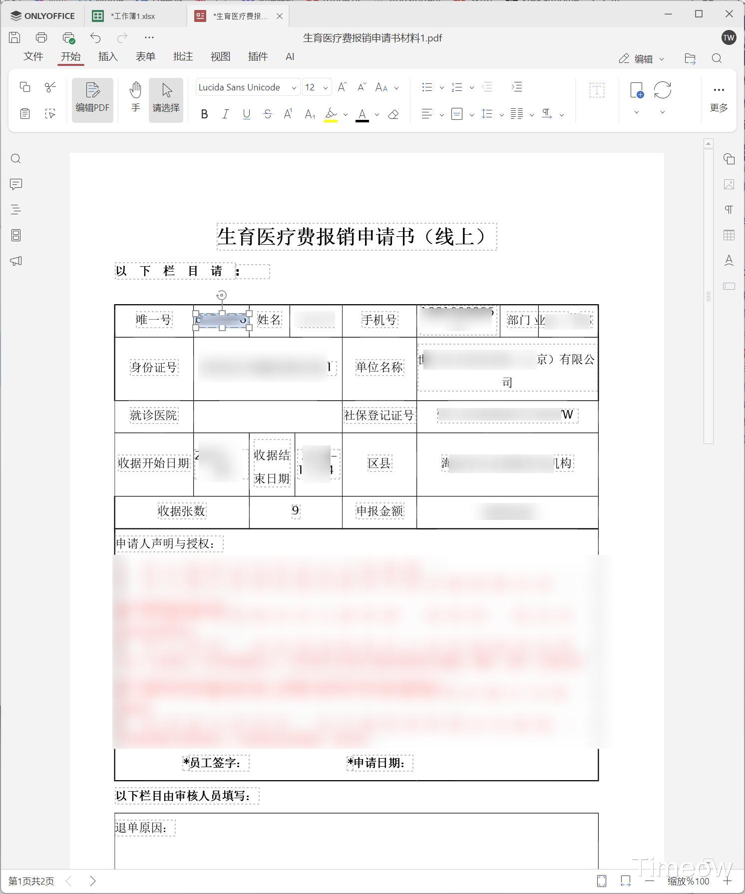 比如单位发来的生育医疗费报销申请表,我可以直接用ONLYOFFICE打开并编辑,方便极了。