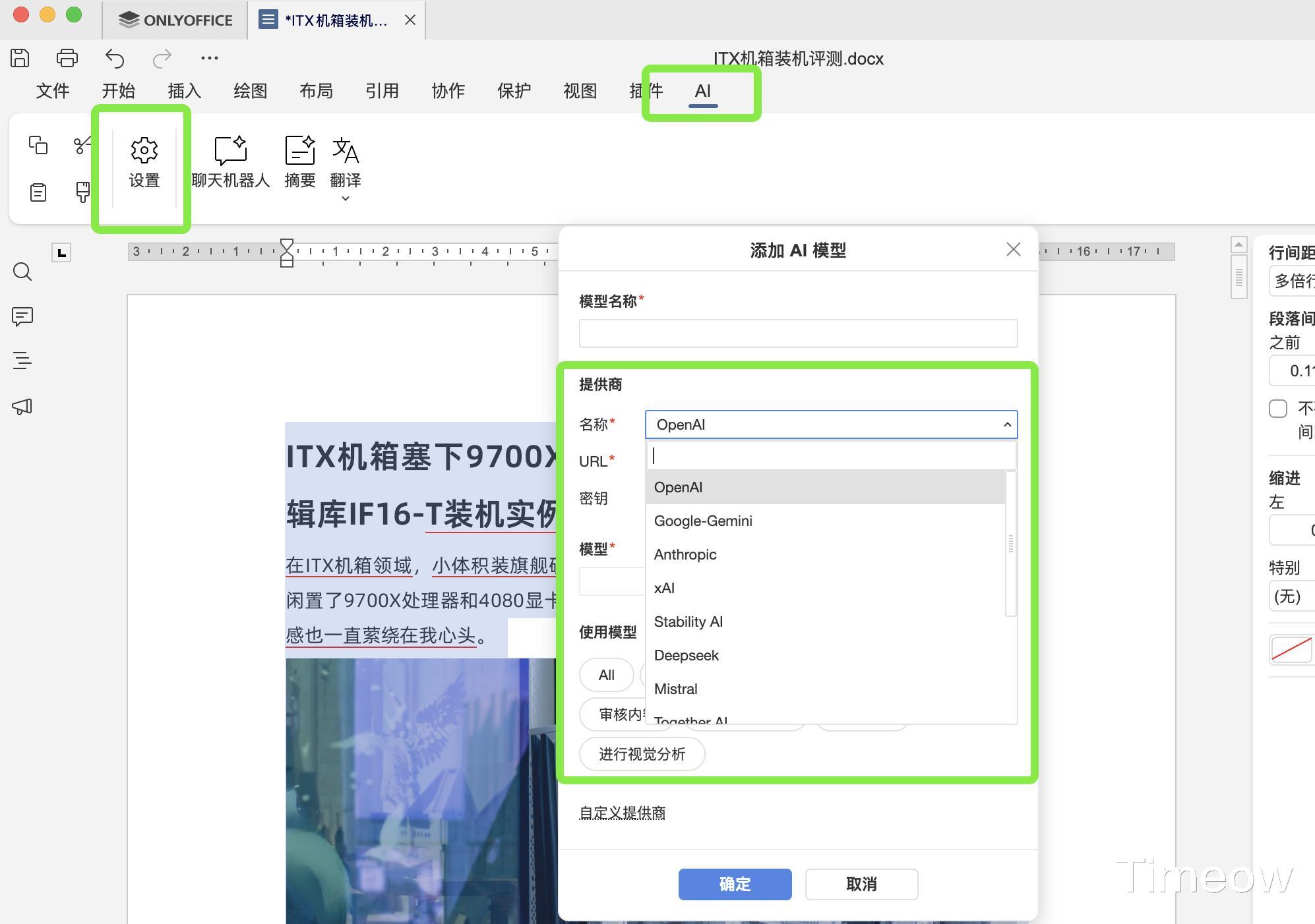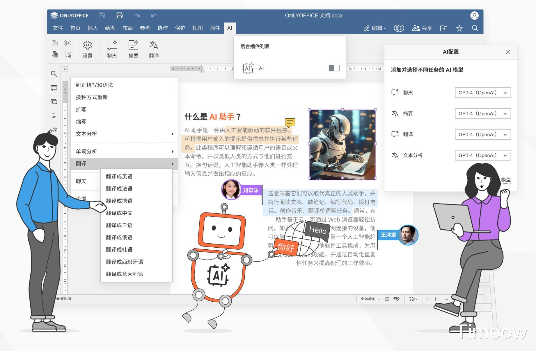 AI插件——可接入任意大模型 全场景文档处理相较于其他多数办公套件固定AI模型+有限功能的局限,ONLYOFFICE推出的AI插件 功能有着超高的灵活性。