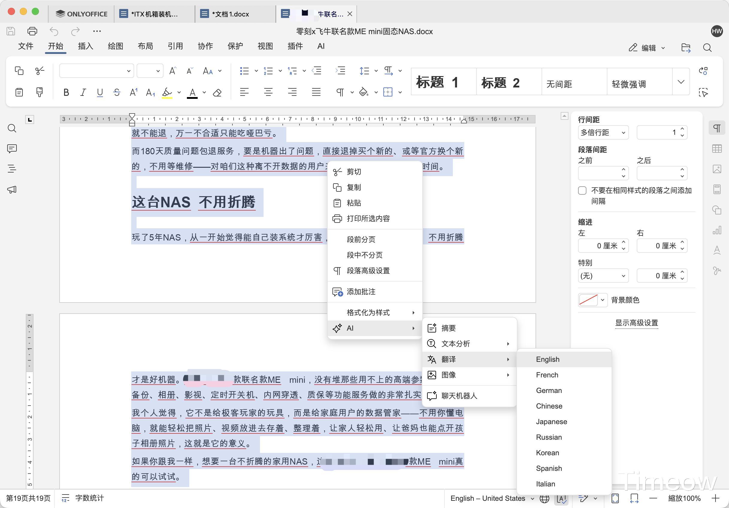虽然咱也能歪果仁比划着聊天,但真要用外语写作,那可真是累死人。更何况自己勉强掌握的外语只有一种,所以ONLYOFFICE的AI翻译真的帮老大忙了。