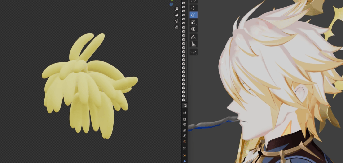 无法还原白厄原来漂移的发型,就用香蕉自制了一个没有物理效果的头发。虽然这些办法都很奇怪,但这就是没有经过系统学习的小白,力所能及的方式了。