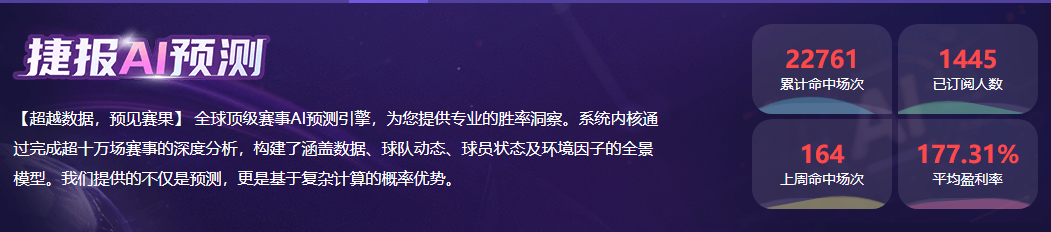 而在球迷常用的赛前分析中,很多人还会参考更多方向,例如主任。这也是捷报体育AI预测系统与传统胜平负概率预测的区别所在:AI不仅结合历史交锋、近期状态、伤停情况,还会综合数据变化给出更多选择的参考,帮助球迷更细致地理解比赛走势。