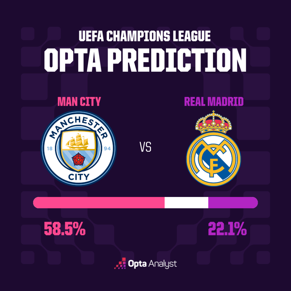 数据机构Opta的超级计算机预测显示,曼城在次回合比赛中的赢球概率达到58.5%,明显高于皇马的 22.1%。然而在两回合总比分层面,曼城真正完成逆转、晋级欧冠八强的概率却只有 13.4%。