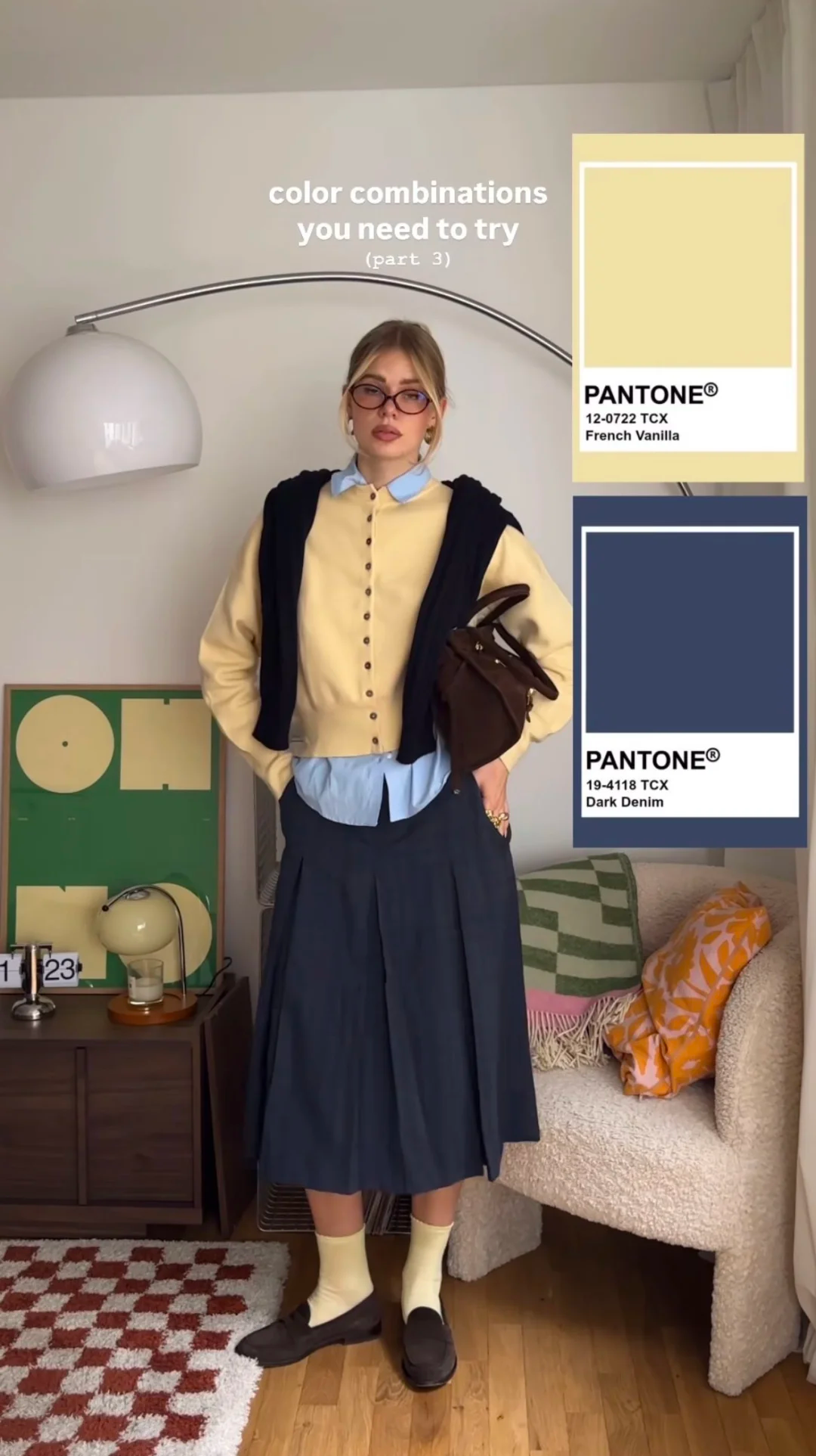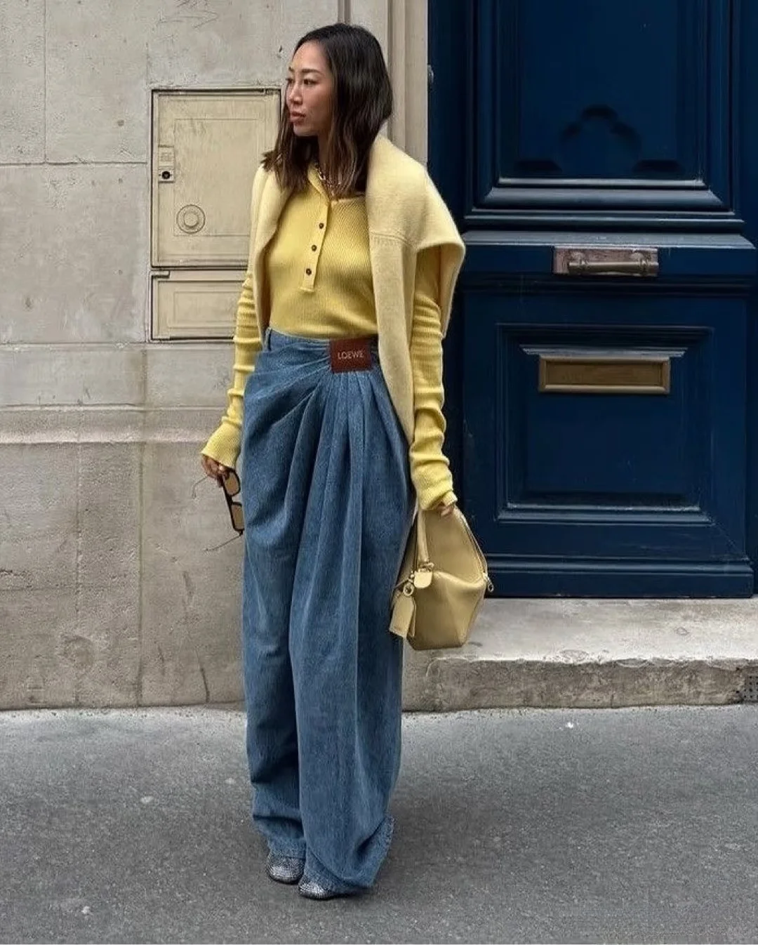 给黄色毛衣叠穿一件蓝色T恤,再配上藏蓝色阔腿裤,柔软的黄是主调,从宽松的领口与下摆不经意露出的蓝T边缘,像是为这份暖意镶上了一道冷静的边。藏蓝色阔腿裤则以深邃的垂坠感承接一切,将跳跃的活力沉淀为沉稳的气场。