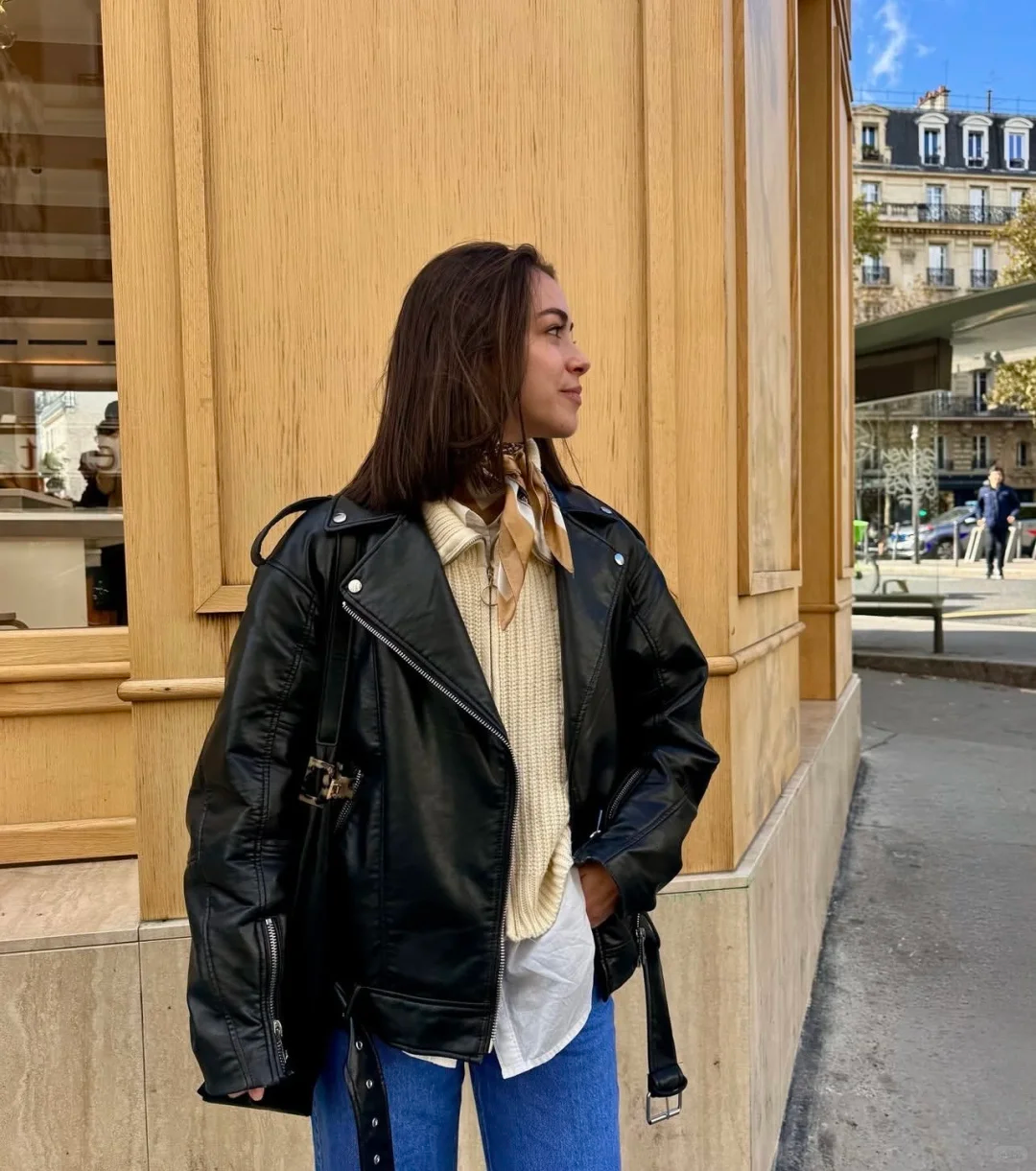 复古格调的皮夹克与内搭的黄色针织衫,下身复古蓝阔腿裤的加入,以丹宁质感中和了上身的厚重,随性中拉长身形。