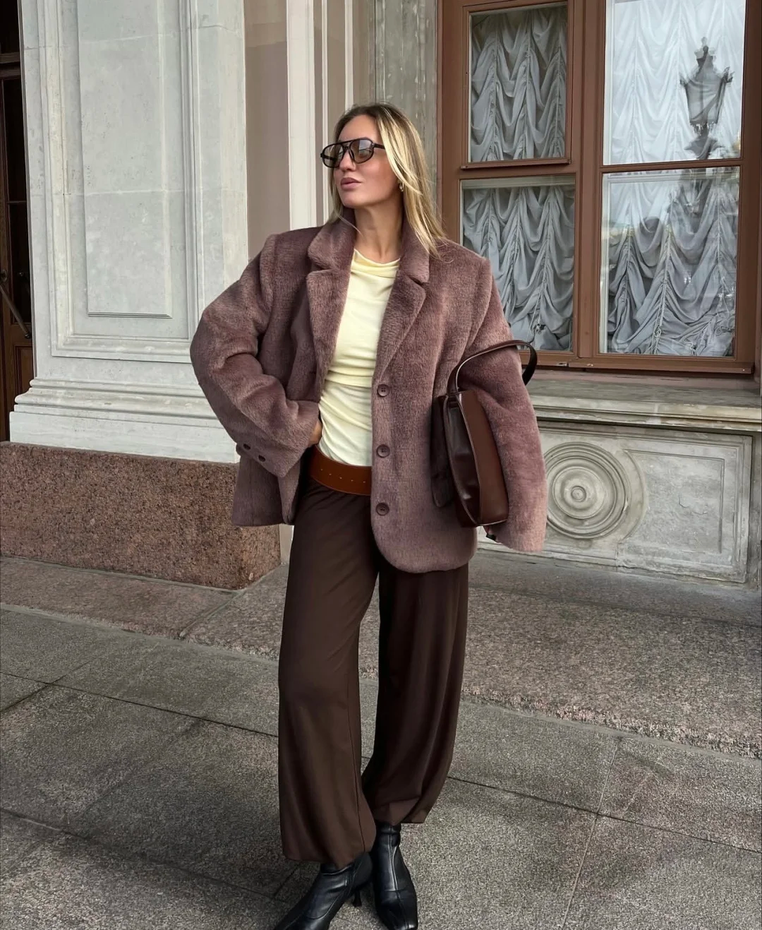 穿咖色皮草\毛呢外套,就可以配一件黄色针织打底衫来提亮。