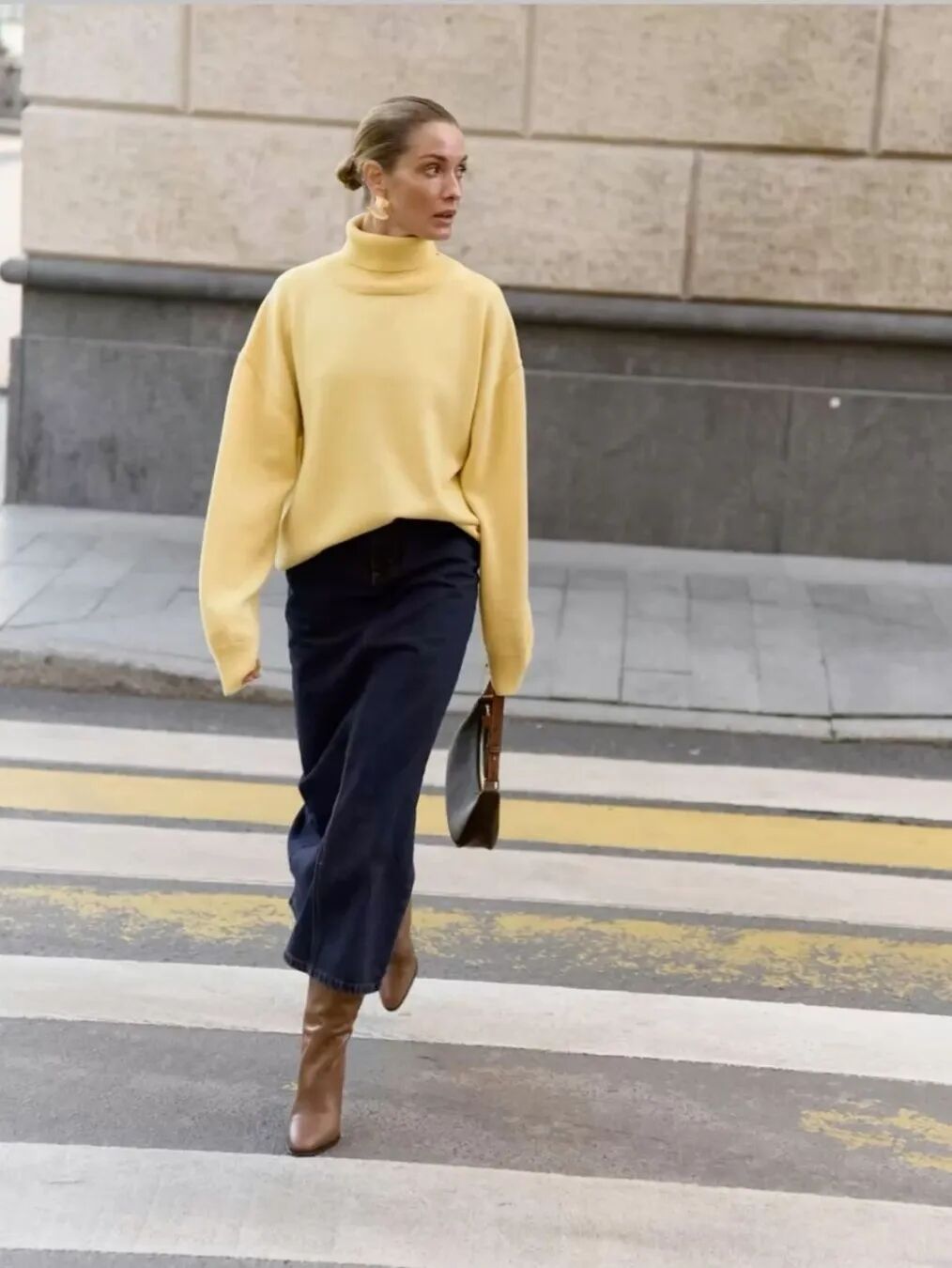 黄色高领毛衣搭配黑色半裙,黑色半裙作为沉稳的基底,它收敛、神秘,稳稳地托住这份耀眼,让明亮不至于轻浮。