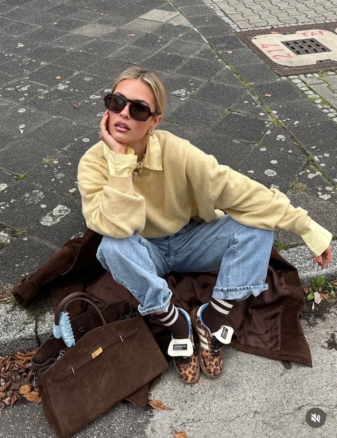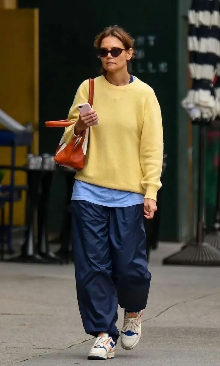 姜黄色毛衣搭配蓝色牛仔阔腿裤,色彩对比鲜明却无比和谐。同色姜黄运动鞋,精巧地完成了视觉闭环,将温暖感从上身延伸至足尖。