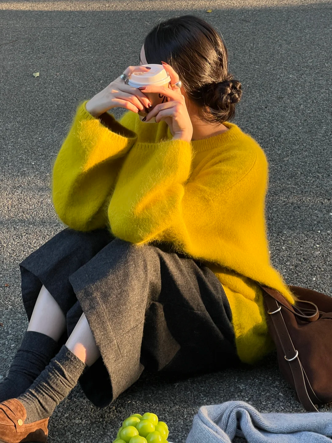 再拎一个黄色包包,和黄色毛衣呼应起来,和谐高级。