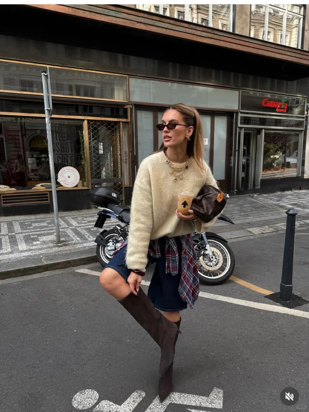 淡黄色毛衣与卡其色阔腿裤,是同属大地色系的温柔合奏。淡黄明亮,卡其沉稳,两者以柔软的针织与垂坠的裤型相连,营造出极致的松弛与高级感。同色系的包包则完成了色彩的统一与延伸。