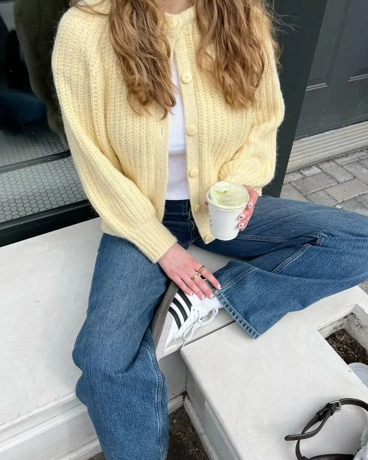 淡黄色毛衣搭配白色阔腿裤,配色干净得如同剥开的新鲜蜜柚,清甜又明亮。