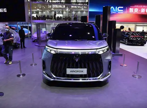 车身侧面,新车的侧面线条流畅规整,平直的车顶设计最大化保障了头部空间,双侧电动侧滑门的配置实用便捷,乘客上下车无需费力推拉,尤其方便老人与儿童使用。19英寸多辐式轮毂采用双色设计,造型简约大气,与车身整体风格相得益彰。车尾设计简洁沉稳,贯穿式LED尾灯与车头形成呼应,灯组下方的“ARCFOX”标识采用发光设计,提升了品牌辨识度。车尾底部配备了宽大的银色护板,搭配隐藏式排气布局(增程版),让整车风格更显统一。车身尺寸方面,结合同级别车型推测,新车轴距有望突破3100毫米,为车内三排座椅的空间布局奠定坚实基础,充分满足多人口家庭的出行需求。配置方面,预计将搭载华为乾崑驾驶辅助系统。这套系统依托激光雷达、毫米波雷达及高清摄像头的多重硬件加持,可实现L2+级全场景辅助驾驶功能。