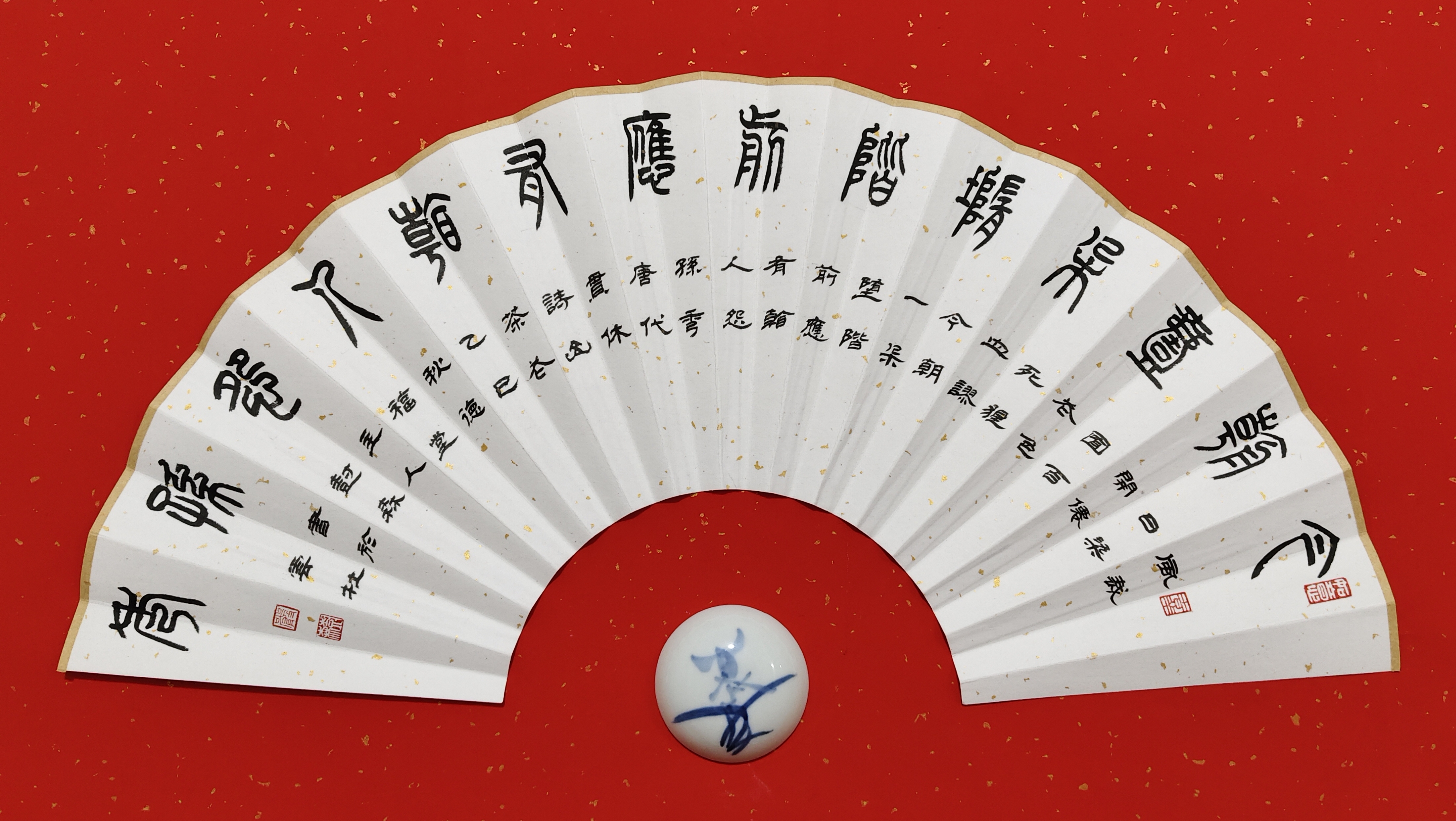 书法家严树森篆书扇面: 《咏朱墨斋山茶花》(宋)金朋说