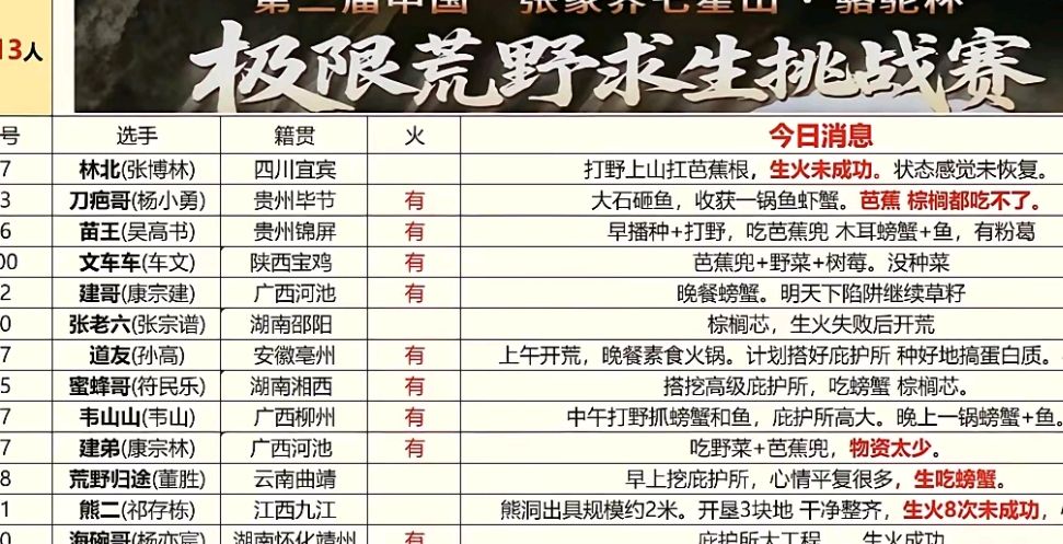 赛事总策划龙武随后确认,退赛的直接原因是“肠胃不舒服”。这一官方声明,迅速终结了“被野猪咬伤”等网络传言,将焦点拉回现实——在极限生存的残酷环境下,消化系统的崩溃远比猛兽更具威胁。这已是决赛中第三起因身体问题退赛的案例,此前“建弟”因腹痛、“扛海碗”因脚伤退出。在食物匮乏、卫生条件原始的环境中,一次看似微小的饮食失误,就可能让数日的坚持瞬间归零。肠胃问题,成了这场耐力赛中看不见却最致命的“头号杀手”。