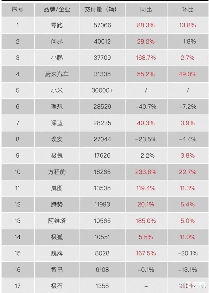 一些品牌出现了同比暴涨:方程豹 16,265 辆、岚图 13,505 辆(同比增长 119%)、阿维塔 10,565 辆(同比增长 185%)和魏牌 8,028 辆。这些品牌去年同期基数不高,现在正开始发力。