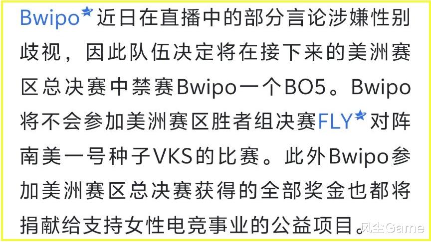 FLY俱乐部在收到举报之后,做出禁赛一个BO5的处罚,同时还把Bwipo第三赛段的奖金,全部捐给了支持女性电竞事业的公益项目,说实话这波操作,是真让人看不懂,Bwipo的所有发言,都是根据事实来的,女性打电竞比赛的时候,确实要面临这些问题,结果有人连事实都没法接受。