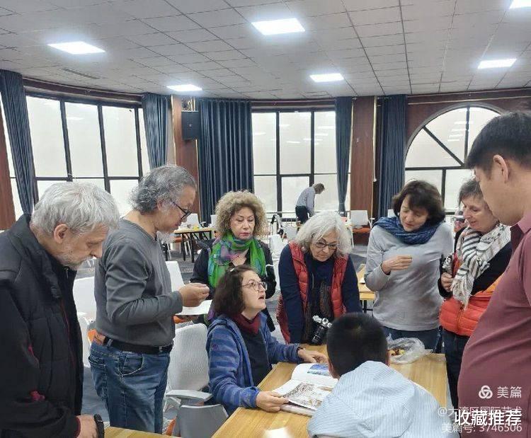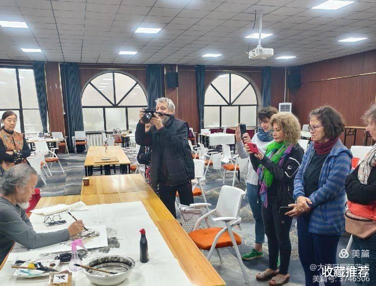 德国艺术家观看画家武剑飞教授现场创作重彩绘画。