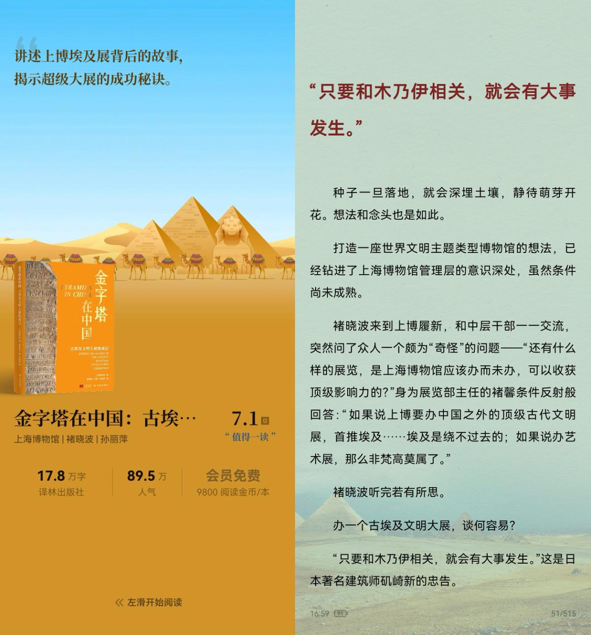 我近期看的是《金字塔在中国:古埃及文明大展炼成记》,这本书是华为阅读独家书籍,不仅用深入浅出的语言介绍了一场跨国大展是如何炼成的,还加入了“AI动态图书”能力,当用户注视书中的插画时,AI动态图书可以让静态的插画“活起来”,让阅读更加身临其境。目前在搭载了HarmonyOS 6的华为Mate X7新机等多款机型上可以体验这项能力。