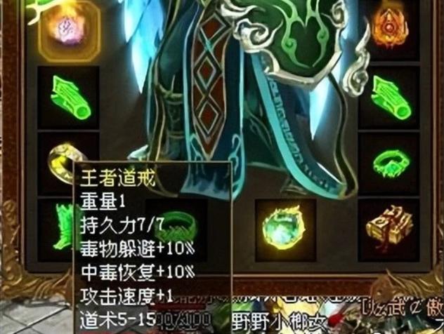 10% 毒躲 + 5-15 王者道戒:一人守沙的惊世之作!天才道士的这枚王者道戒,堪称道士玩家的终极梦想 ——10% 毒物躲避 + 5-15 道术属性,攻防辅助拉满!当年正是靠着这枚关键戒指,天才道士完成了 “一人守卫沙城” 的壮举:毒躲属性让对手道士的施毒术形同虚设,超高道术加持下的治疗和攻击,硬生生扛住了敌方一波又一波的猛攻。要是没有这枚戒指,传世历史上恐怕要少一段堪称史册的传奇战役!