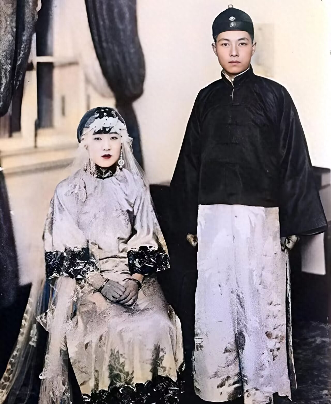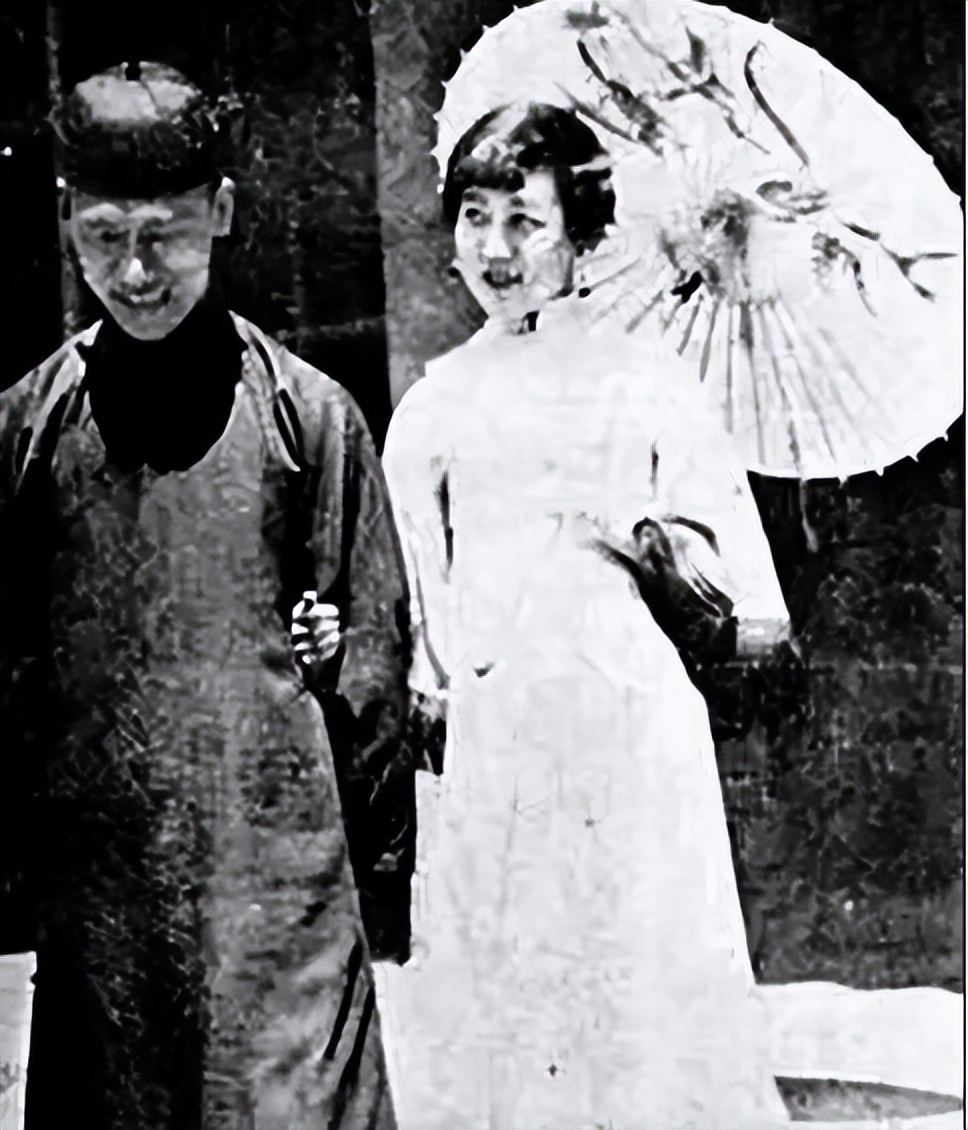 1927年,在旅順大和旅馆内,川岛芳子与新婚丈夫甘珠尔扎布留下了一张罕见的新婚照,镜头中,川岛芳子盛装打扮,穿着一身中式