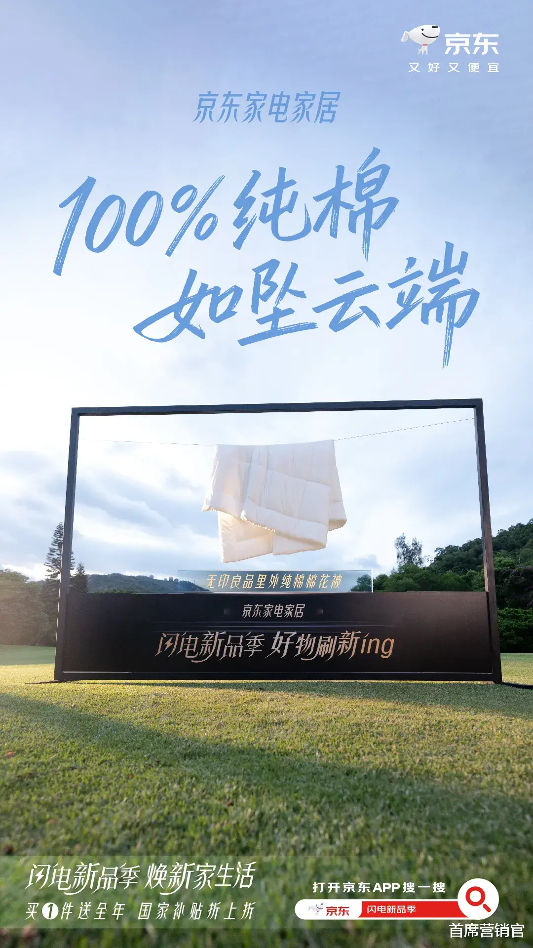 再说家居产品,为了让消费者体验其舒适性,京东倒反天罡地把芝华士的白月光功能沙发、喜临门玄武工学床垫、无印良品里外纯棉棉花被等都搬到了户外,把蓝天当屋顶,把大地当地板,把大自然当客厅、卧室、阳台,让人们可以随时随地躺平一下,淋一淋日光浴,晒一晒班味。