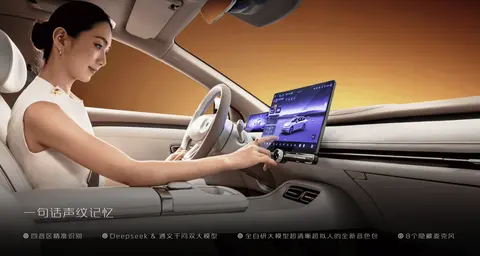 车机芯片采用8676(4nm工艺),算力达280K DMIPS,支持四音区识别、多屏联动。接入了DeepSeek和通义千问双AI大模型,语音交互的拟人度和场景理解能力有所提升。