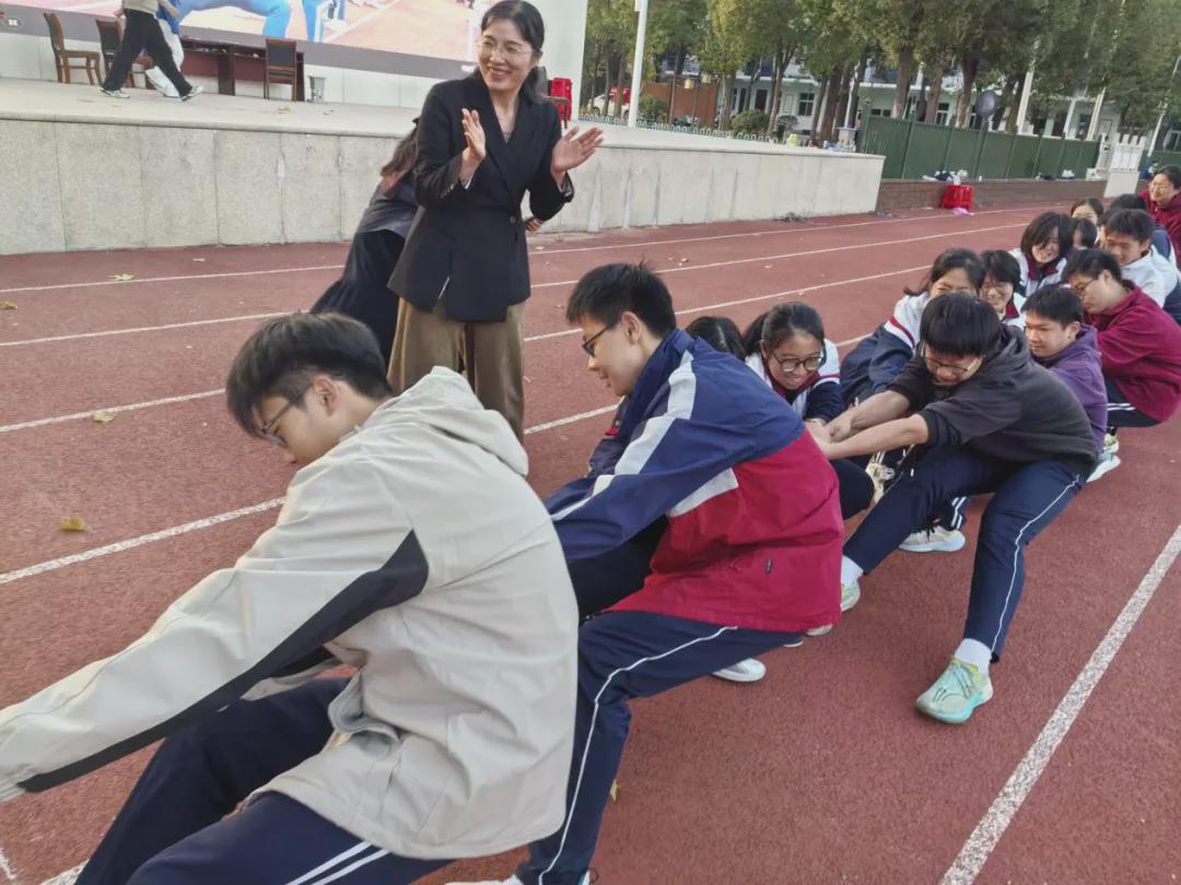 专为舒缓九年级学习节奏设置的专属拔河赛,成为赛场“人气王”。选手们弓步蹬地、青筋暴起,校服被拉得微微变形却依旧紧握长绳;身后的同学们攥紧拳头,整齐划一的 “一二、一二” 助威声震彻全场。当红绳越过中线的瞬间,欢呼声冲破跑道,秋阳下绽放的笑容,定格成青春最生动的模样。