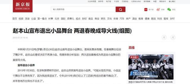 新京报于2013年01月31日发布的 关于《赵本山宣布退出小品舞台 两退春晚成导火线(组图)》的报道