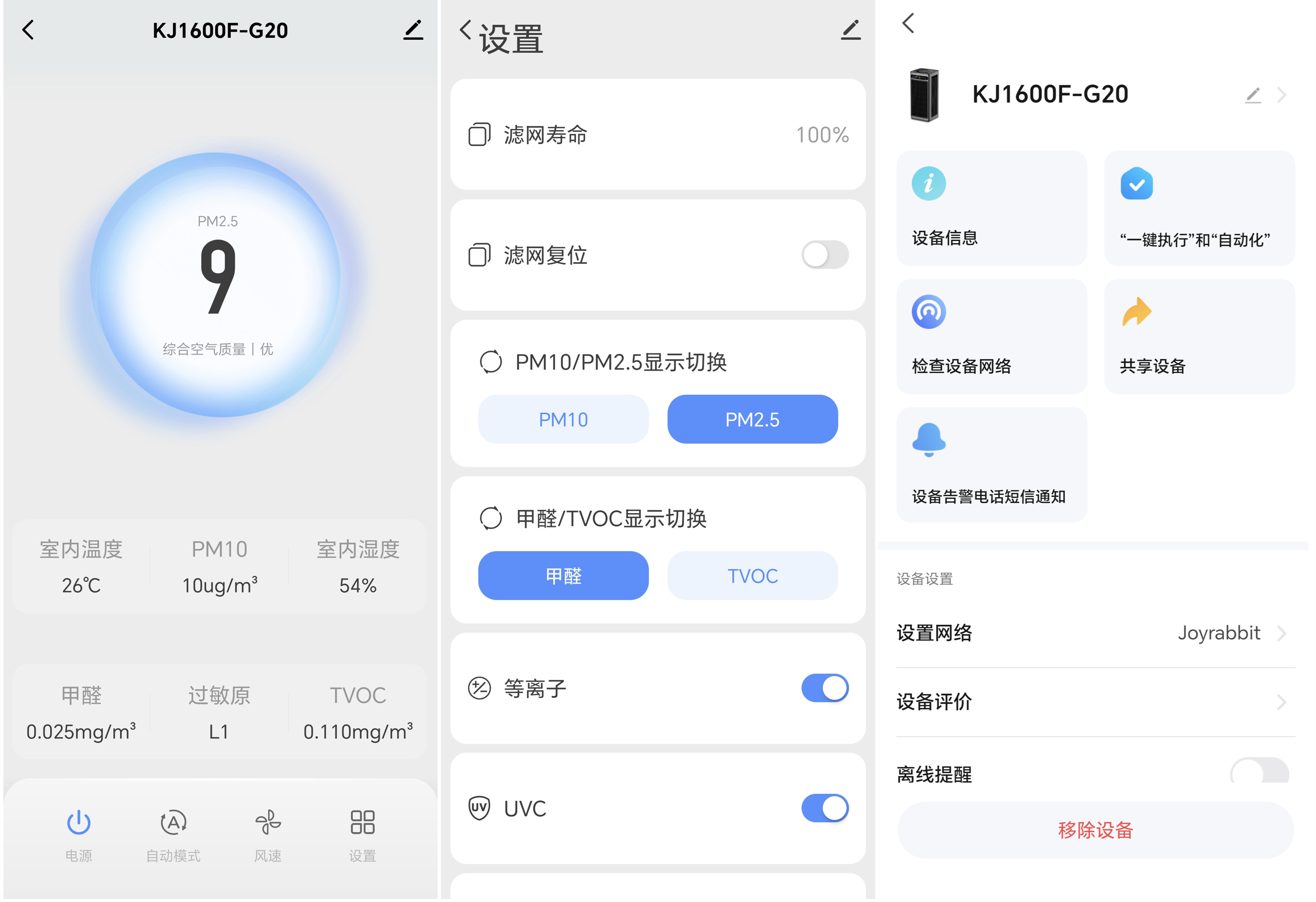 现在都是智能家居,远程控制也是标配。我家装修不久,所以基本上都是24小时开着,远程控制用不太多,但是本着我可以不用,但是不能没有的原则,连APP功能也必须要有。它这个连上手机以后,不仅可以实时看家中空气质量7大参数,也能远程开关机器,调整风速以及各项杀菌功能,如果家里已经入住一段时间,空气质量相对好一些,就可以平时关机,在回家之前再远程开启它,回家时空气就是净化过的,有效提高滤芯使用寿命。