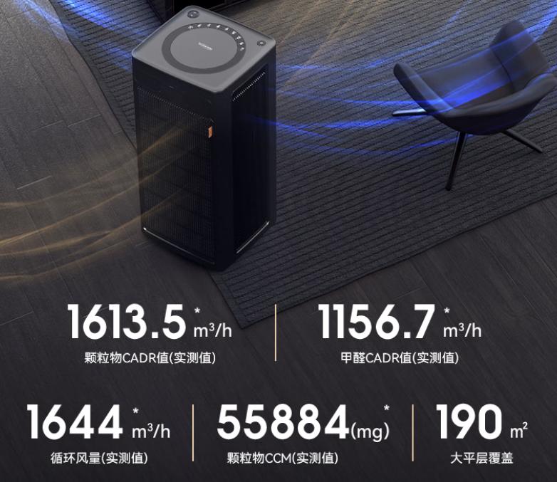 当然,选空气净化器还是得看硬指标,数值上包括CADR值、CCM值、甲醛去除率等等。说起来高大上,其实简单理解就是单位时间内净化速度和效果,普通的空气净化器都在几百立方米每小时左右苦苦竞争的时候,它这个在甲醛和TVOC去除率仍然保持99.5%以上的同时,PM2.5 CADR值直接上到1600多,甲醛也有1100多,这让我们直接不用看了,它能够独霸一方。随之而来的是,它的净化面积可以达到190平方米,像我家三室两厅才128平米,用它一个就够了。而且它的甲醛CCM值还是新国标的8倍,达到了12000毫克,一套滤网能净化超过120桶油漆散发的甲醛量,新房子都能持续用3年,数据上着实是有一些超纲了,说是一台顶三台也不为过。