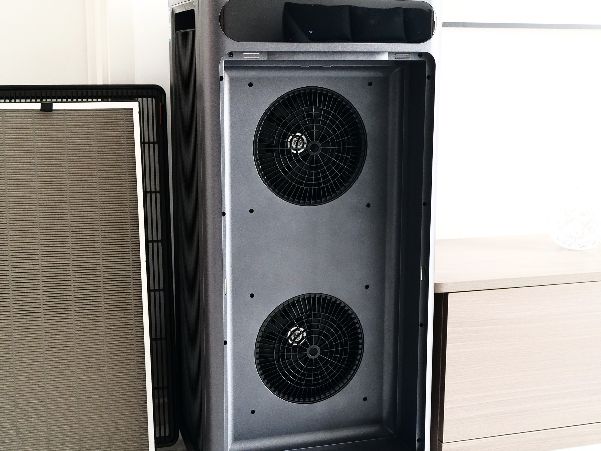 而且它采用的是新一代的双风机净化系统——第五代飓风双擎,前后进风,左右出风的模式,形成了4进风4出风的双流风道,相较于传统的塔式结构,它的循环风量还要翻倍,能达到1644立方米每小时,也就是说一个30平方米,2.7高的客厅,一小时能循环20次以上,平均3分钟就过滤一遍了,这个效率和有效范围真的是一般空气净化器望尘莫及的。