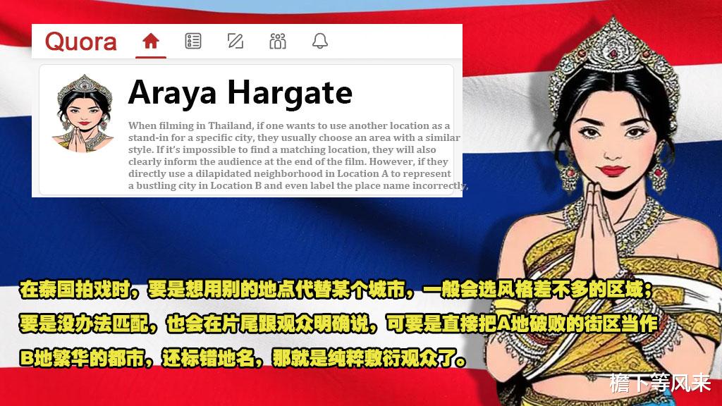 泰国的制片人分析得很到位:在泰国拍戏时,要是想用别的地点代替某个城市,一般会选风格差不多的区域;要是没办法匹配,也会在片尾跟观众明确说,可要是直接把A地破败的街区当作B地繁华的都市,还标错地名,那就是纯粹敷衍观众了。